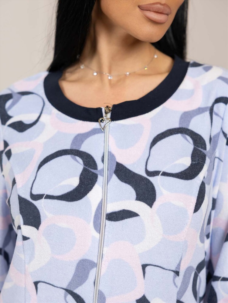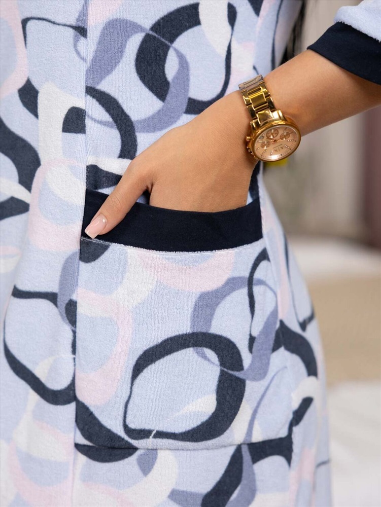 Халат из качественной турецкой махры полуприлегающего силуэта, длиной чуть ниже колена,с контрастной отделкой по горловине, карману и манжену рукава. Рост модели 168см