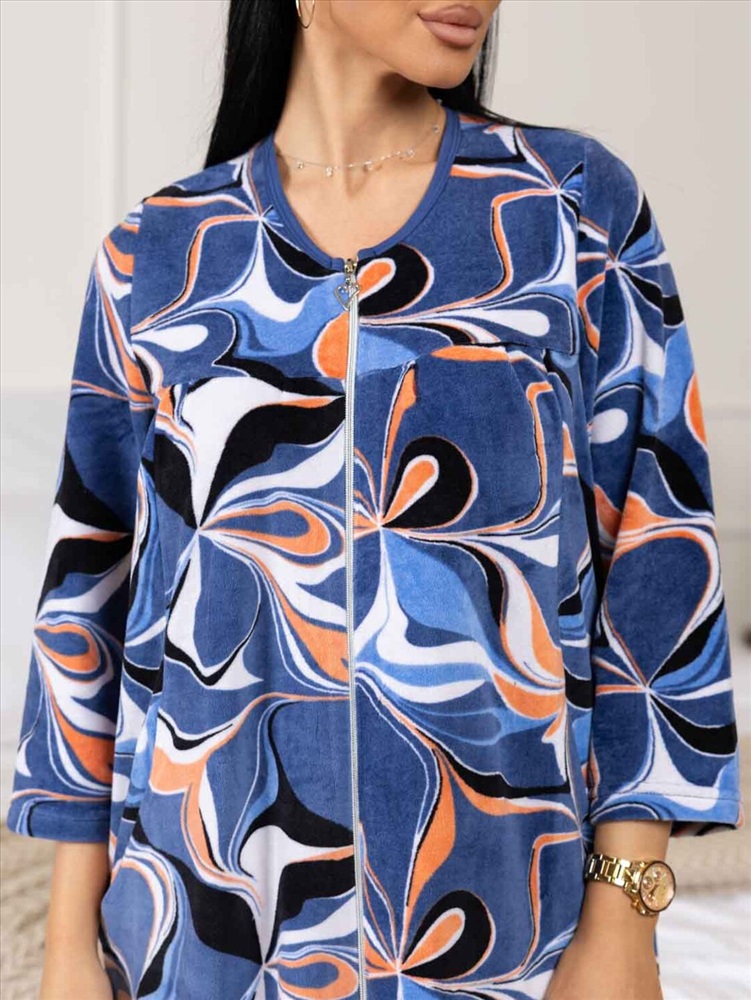 Халат на молни из велюра длиной чуть ниже колена, с базовым втачным рукавом, О-образной горловиной, кокеткой спереди и складками по груди. Рост модели 165см.
