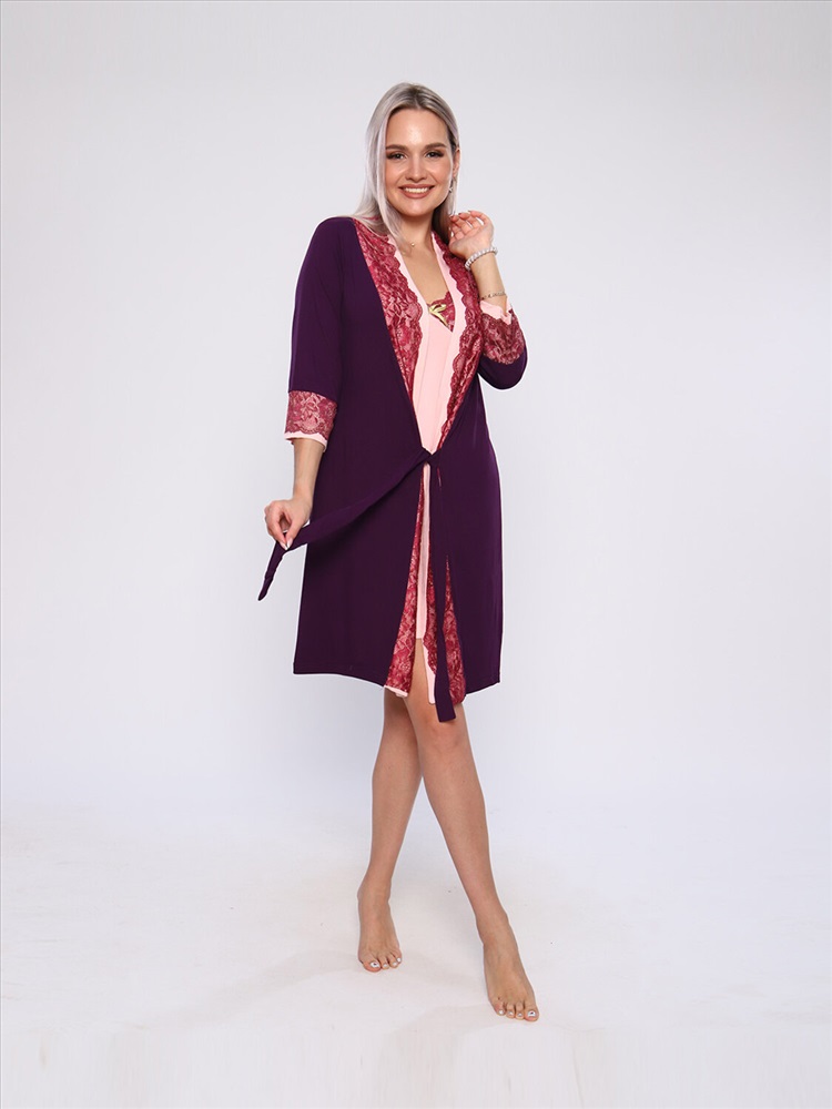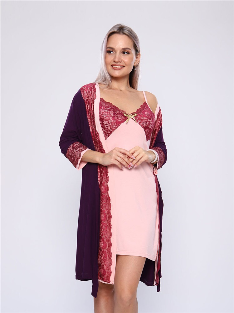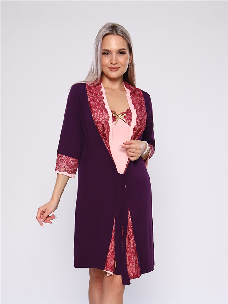 Комплект из пеньюара и ночной сорочки с кружевом. Ночная сорочка на бретелях, V-образная горловина, прилегающего силуэта, на полочке и спинке кружевные вставки в верхней части, длина чуть выше колена. Пеньюар прямого силуэта с поясом, рукав длиной 7/8, по низу рукава кружево, длина до колена.