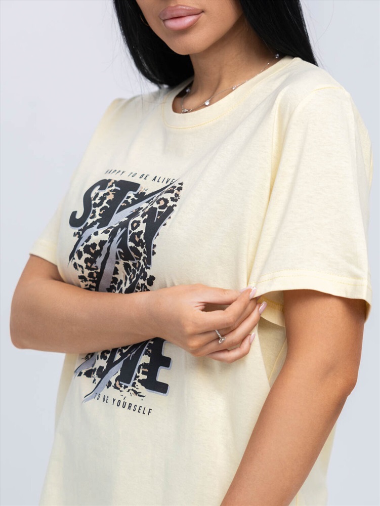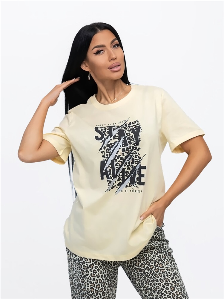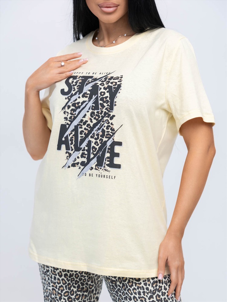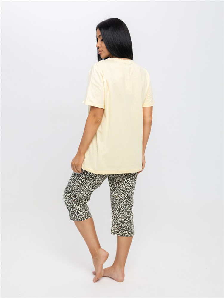Костюм женский из трикотажного полотна, состоящий из бридж и футболки. Футболка полуприлегающего силуэта длинной чуть ниже уровня бёдер с принтом на полке. Вырез горловины О-образный. Бриджи из трикотажного полотна длинной ниже уровня колена.