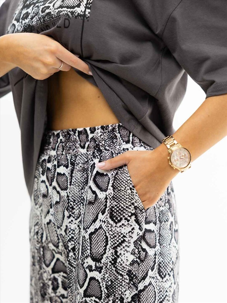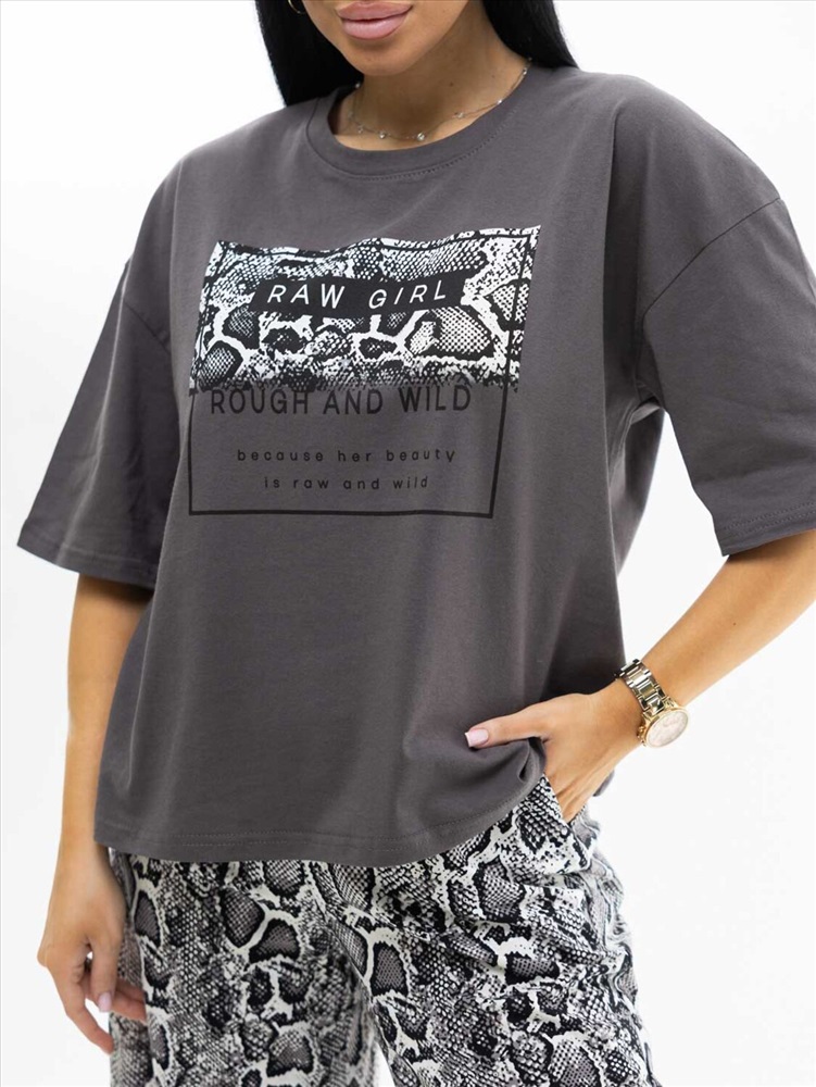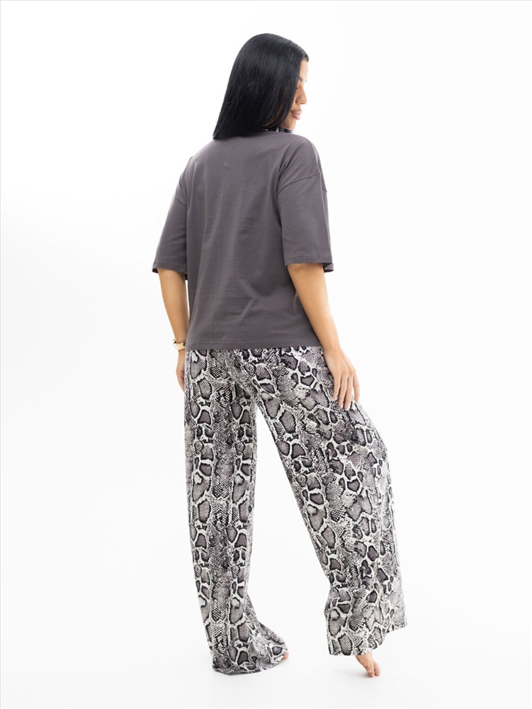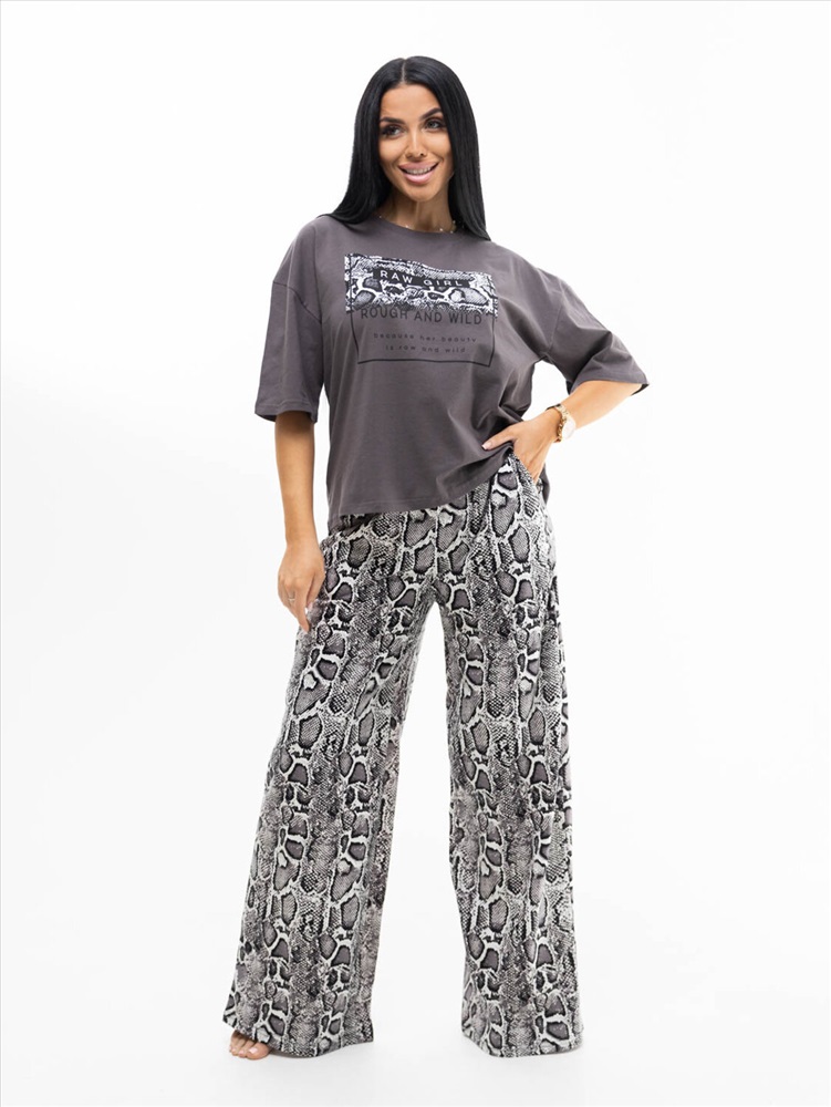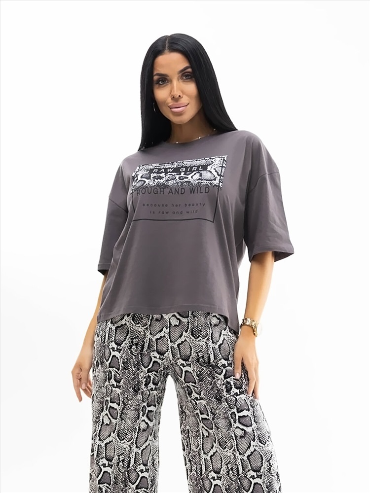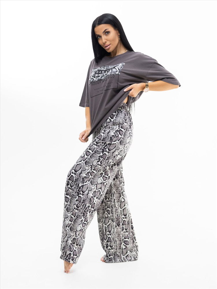 Костюм женский домашний свободного силуэта, состоящий из футболки со спущенным удлиненным рукавом и брюк-шаровар. Футболка с округлым вырезом горловины и печатным принтом. Брюки с поясом на резинке и карманами с отрезным бочком. Стильный современный дизайн и свобода в движении делают данный костюм незаменимым в гардеробе каждой уважающей себя модницы. Идеально для тех, кто хочет быть в тренде, даже во время отдыха.