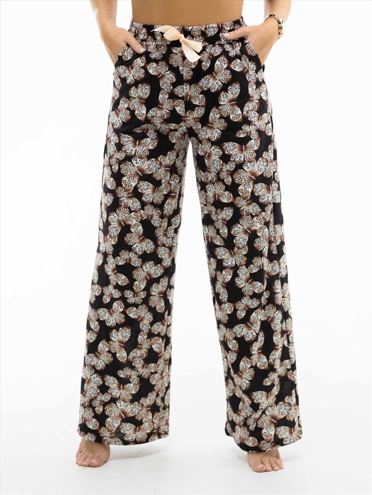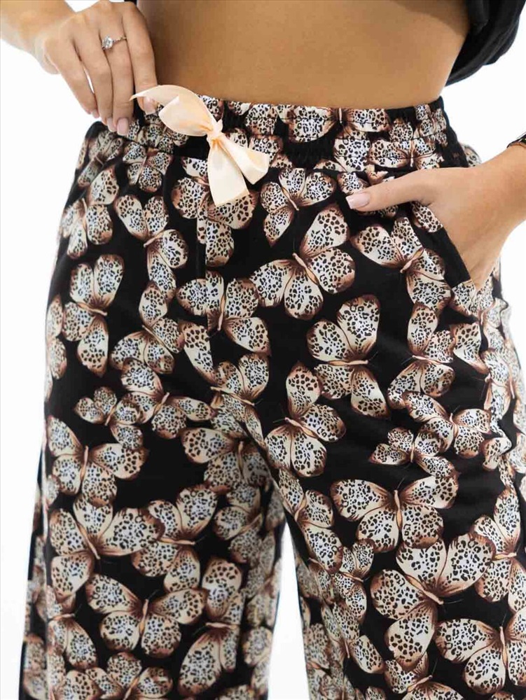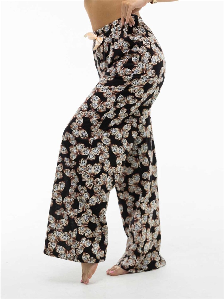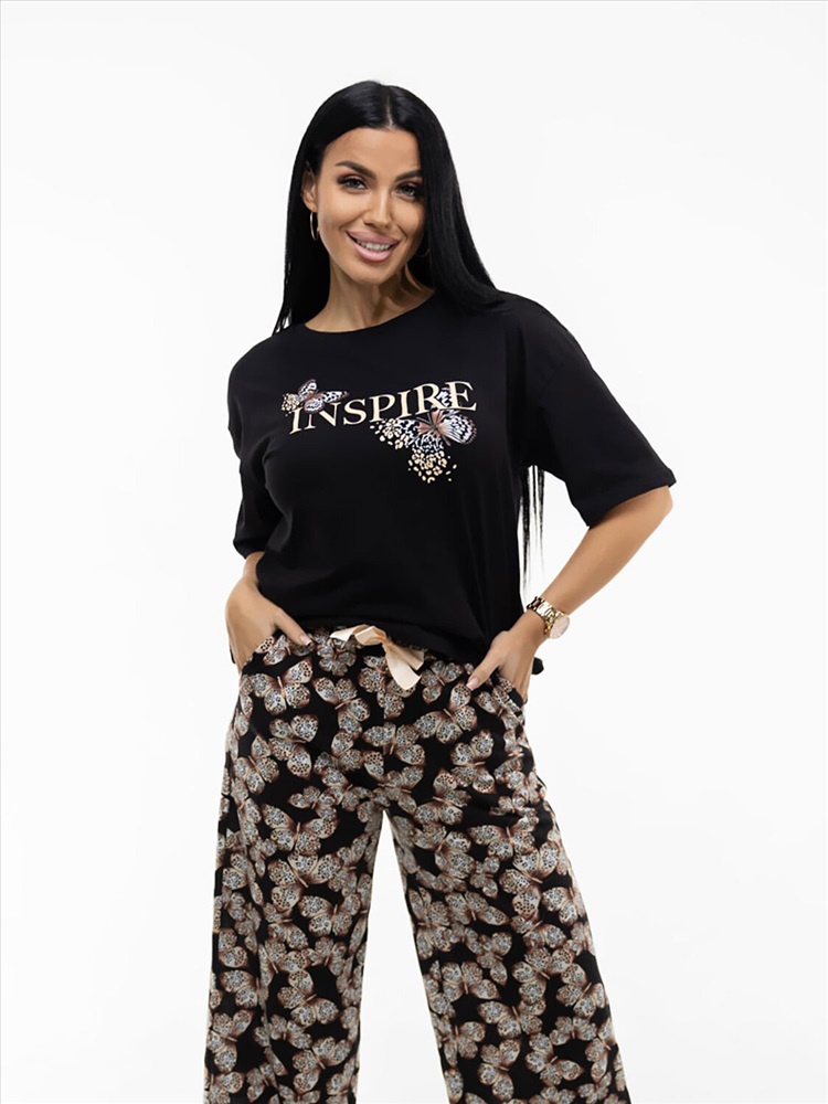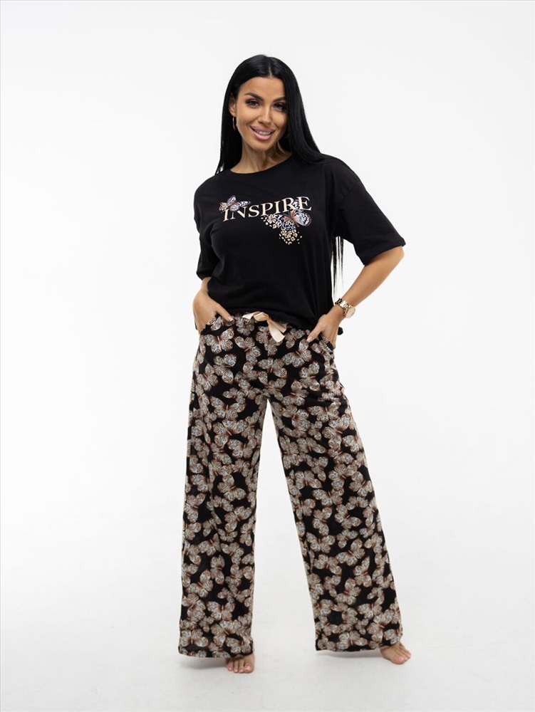 Базовый комплект с широкими штанами и крутой футболкой со спущенной линией плеча и двумя стильными печатями. Брюки выполнены из ткани с рисунком, в боковых швах карманы, на поясе декоративный атласный бантик. Принт на футболке идеально подобран к штанам. Элегантный брючный костюм позволит вам ощутить себя настоящей иконой стиля. Закажите свой уникальный пижамный костюм прямо сейчас и подчеркните свою индивидуальность.