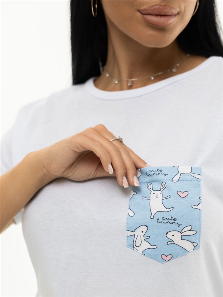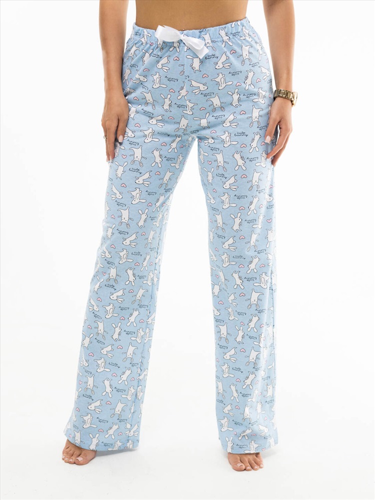 Женский костюм с брюками из 100% хлопка. Футболка со спущенной линией плеча, О-образной горловиной и накладным карманом на полочке. Широкие брюки из набивной кулирки с атласным бантом.