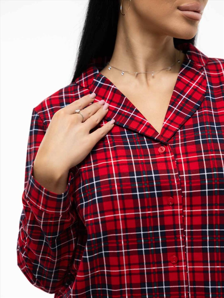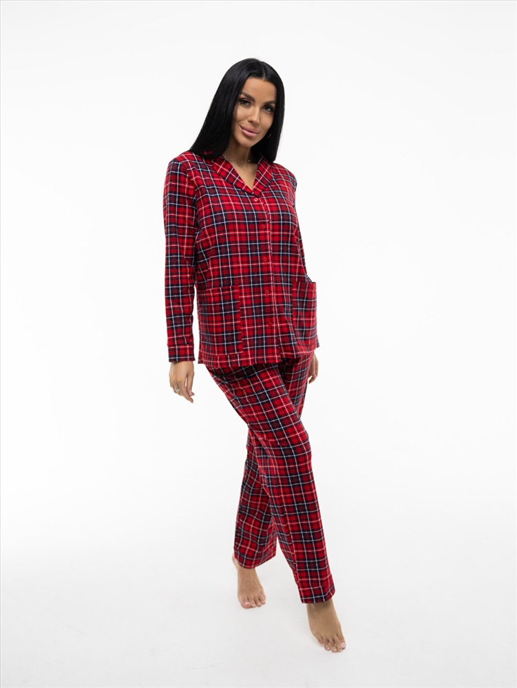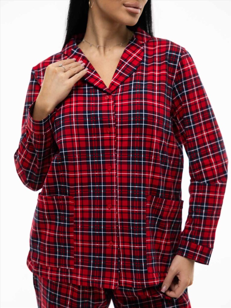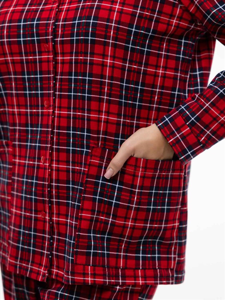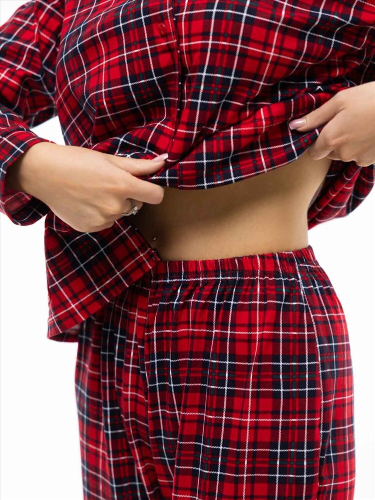 Красная пижама в клеточку с длинным рукавом станет незаменимой вещью в гардеробе любой девушки. Верх пижамы с отложным воротником, базовым втачным рукавом и двумя накладными карманами на полочке. Брюки умеренного объема на резинке. Наш костюм идеально подойдет для пижамной вечеринки с подружками, фотосессии или просто на каждый день.