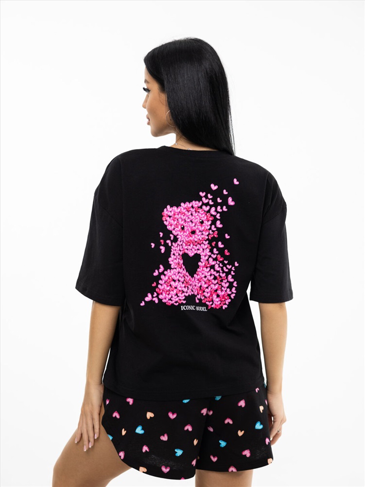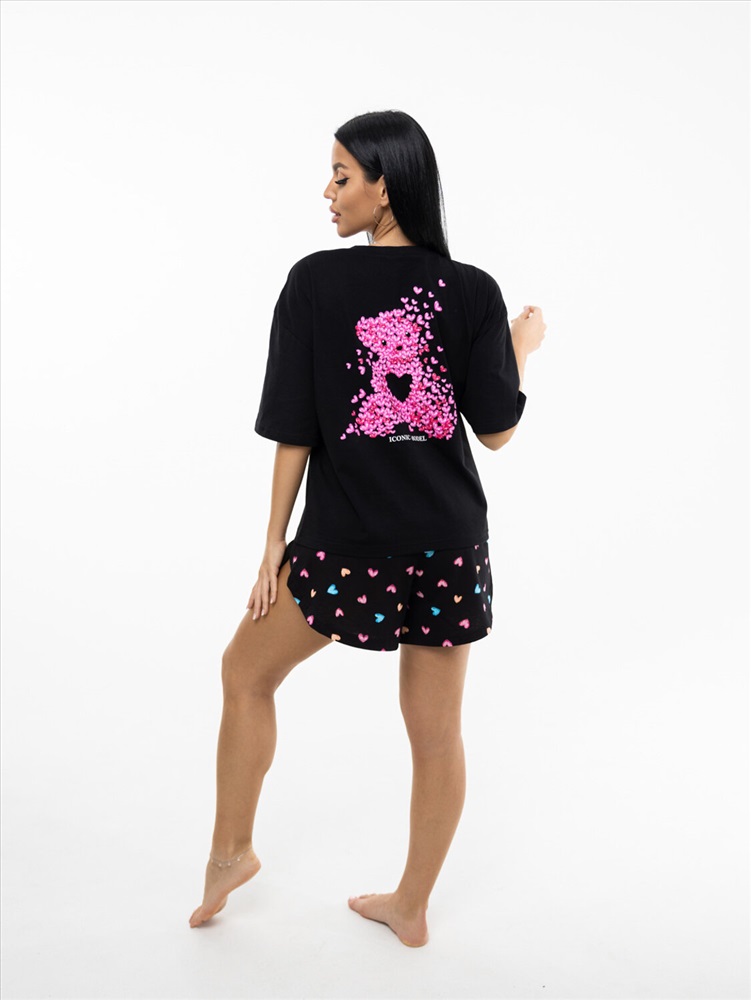 Костюм женский шорты и футболка. Футболка со спущенным коротким рукавом и округлой горловиной. На полочке и спинке печатный рисунок. Шорты - короткие, свободного силуэта, с поясом на резинке и вырезом в области бокового шва, для идеальной посадки и максимального комфорта.