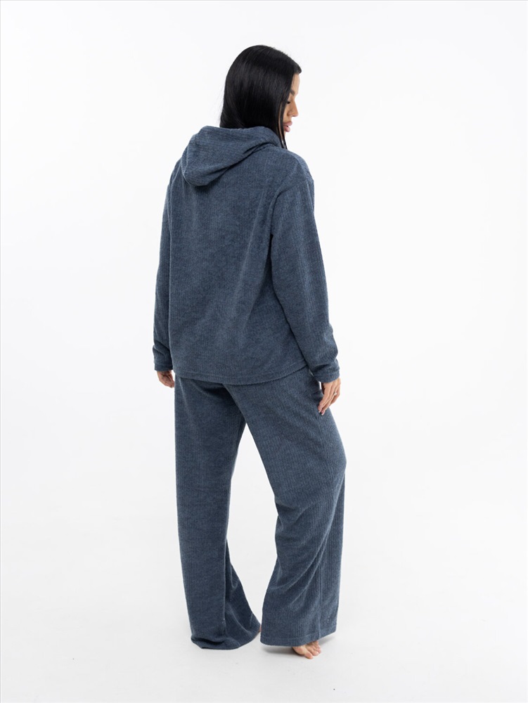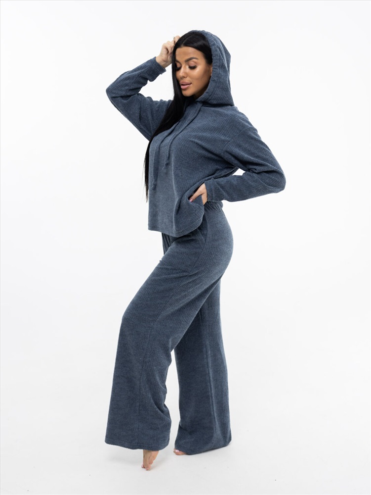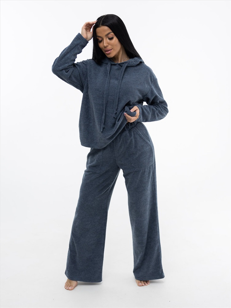 Худи с капюшоном, длинным рукавом и шнурком из основного материала. Широкие брюки с накладными карманами.