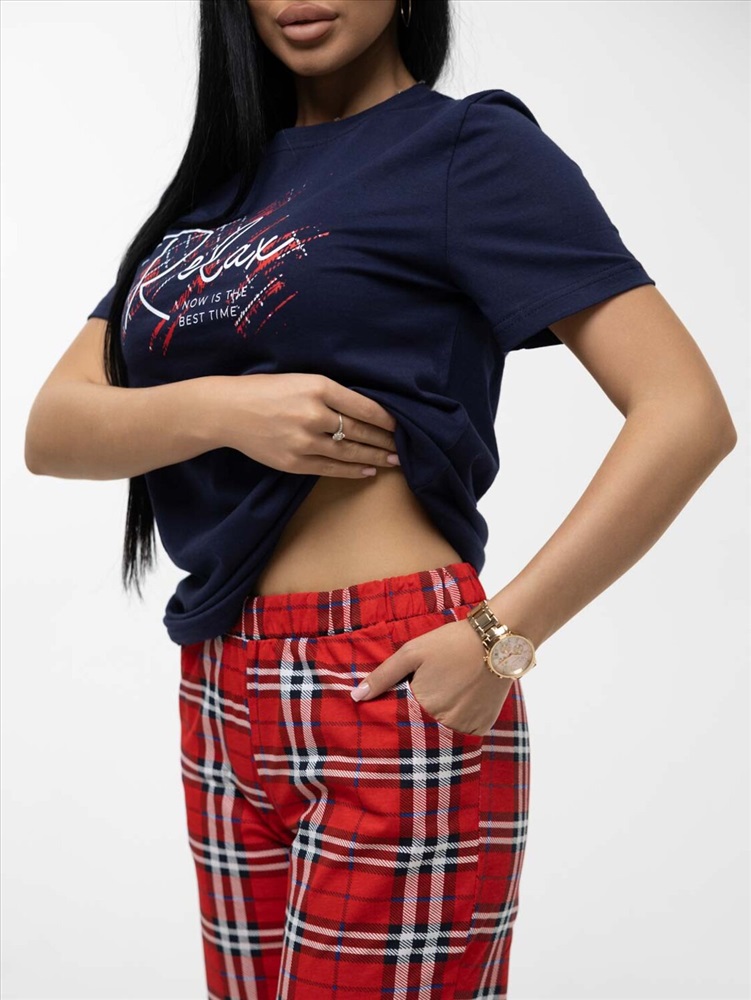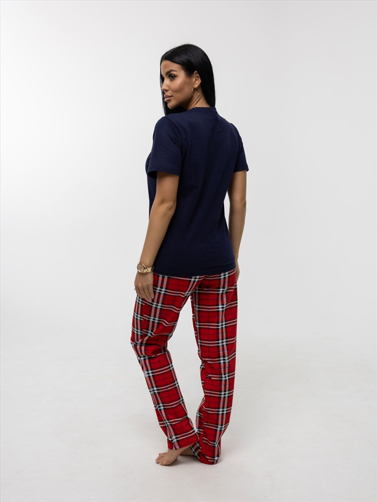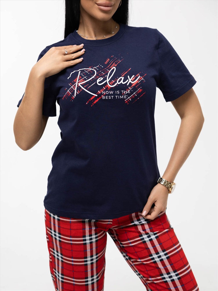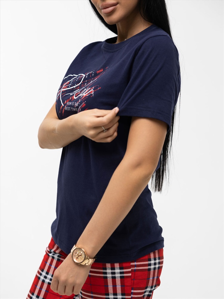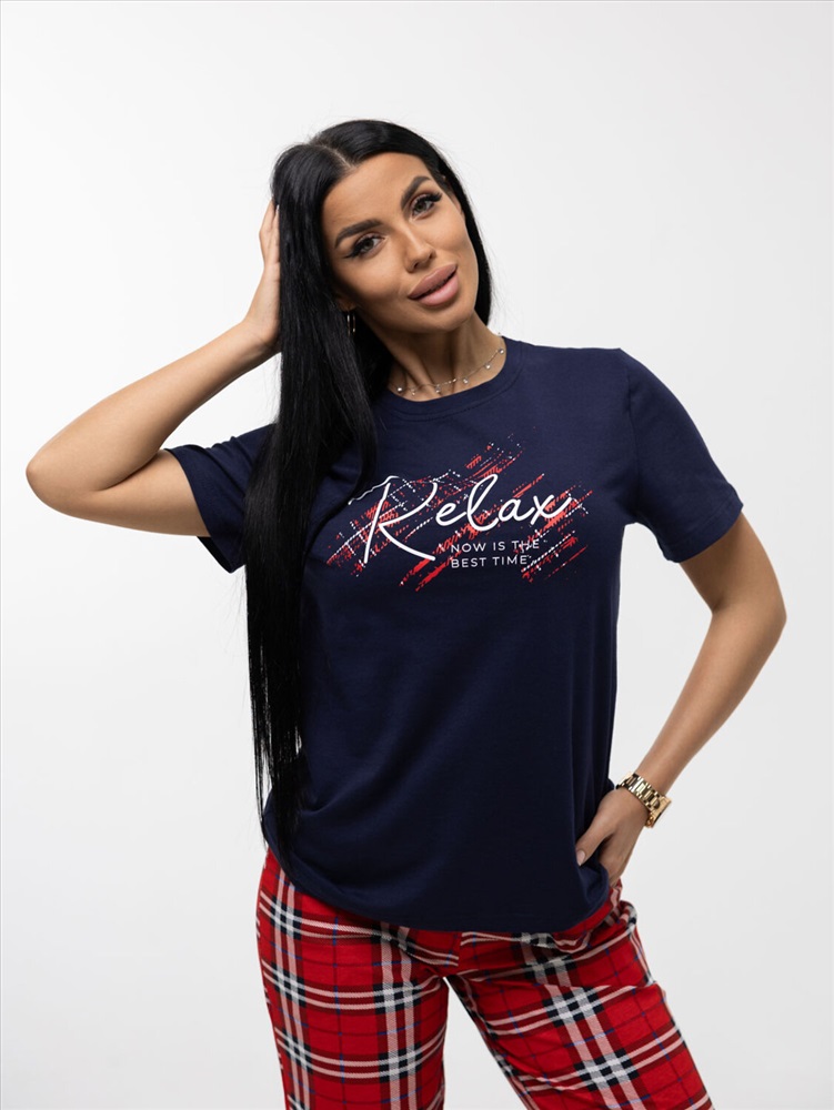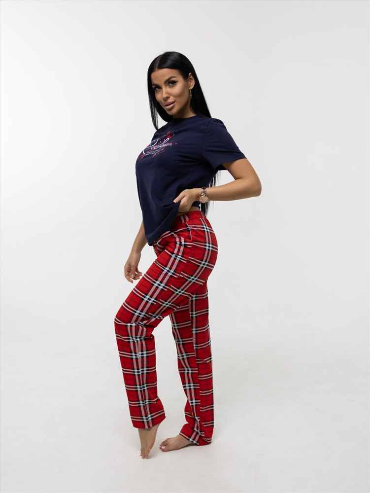 Костюм женский с брюками. Выполнен из качественного трикотажного полотна. Футболка прямого силуэта, с округлым вырезом и коротким втачным рукавом. На полочке стильный печатный рисунок. Брюки с поясом на резинке и удобными карамнами с отрезным бочком.