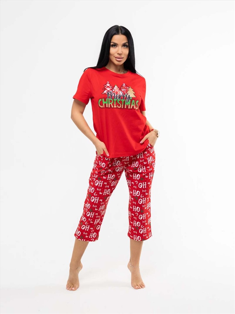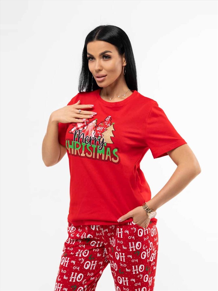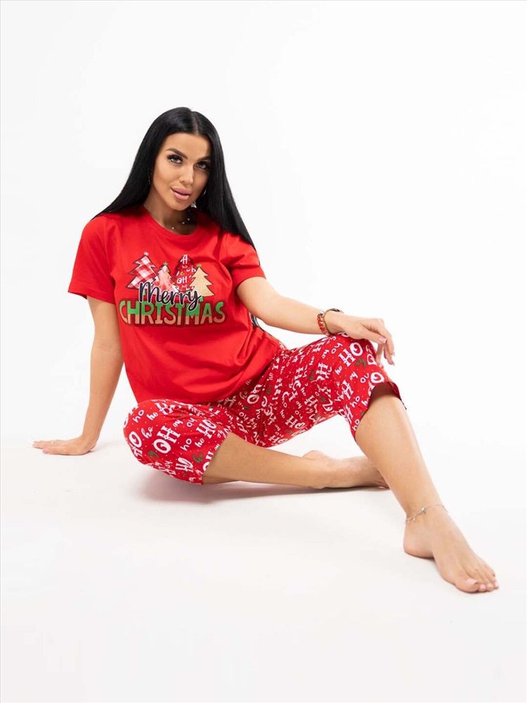 Новогодний костюм из 100% хлопка, уютный и мягкий. Базовая футболка с яркой новогодней печатью, поднимет Вам настроение. Классические бриджи на резинке с карманами будут идеальным вариантом для дома. Костюм отлично подойдет, как для повседневной носки в предновогодние дни, так и для тематической фотосессии.