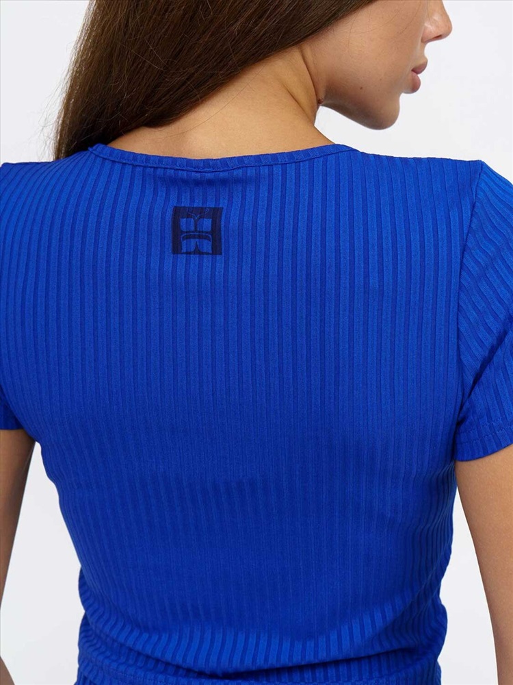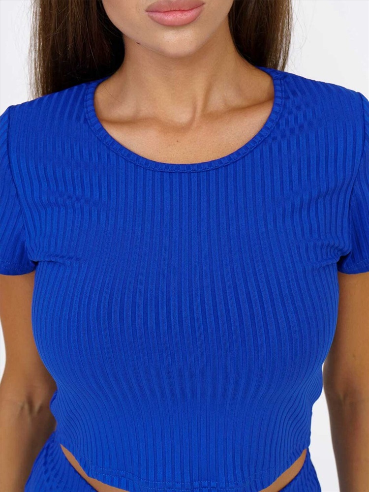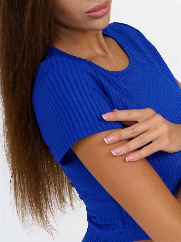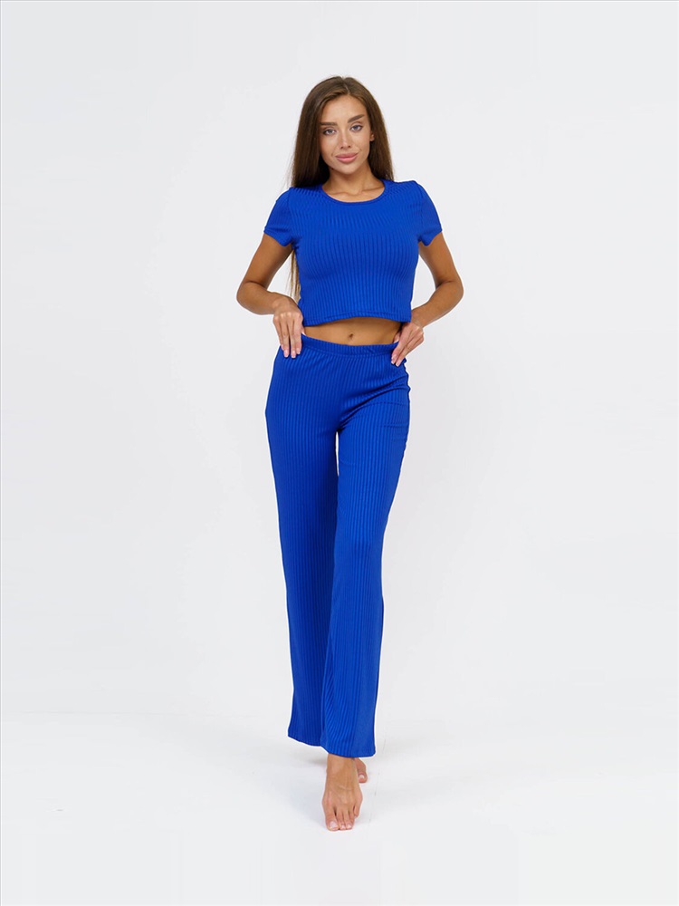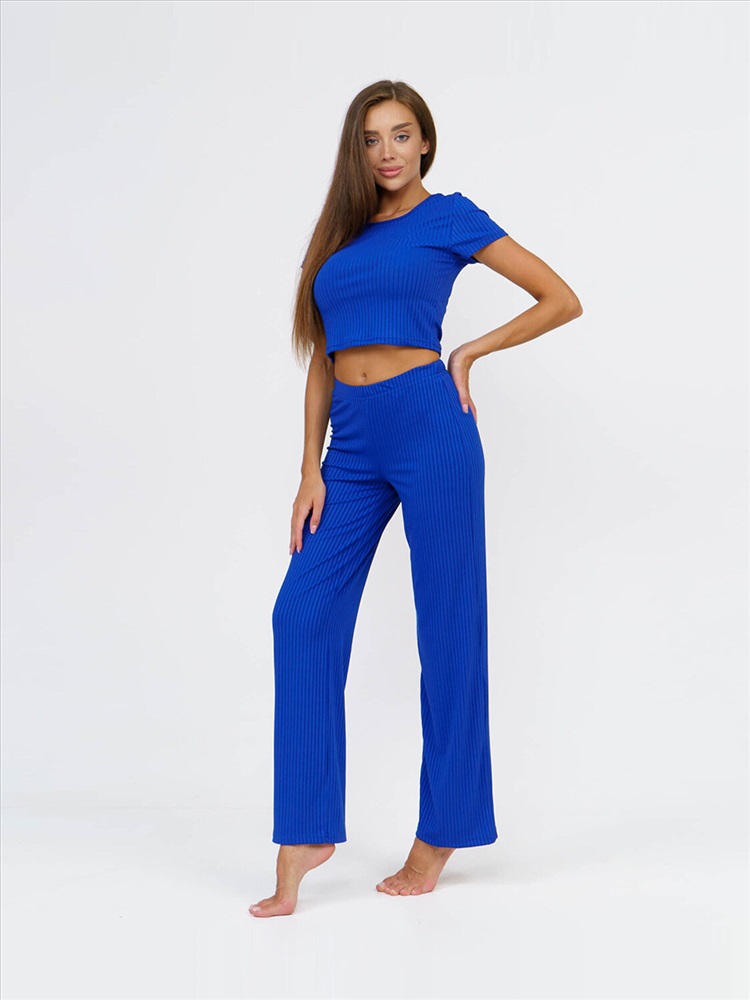 Домашний женский костюм из ткани "лапша" в мелкий рубчик подарит чувство комфорта, идеальная посадка не сковывает движения, выглядит стильно. Укороченная футболка полуприлегающего силуэта с коротким рукавом и свободные брюки в высокой посадкой - идеальный комплект для уютного вечера дома.
