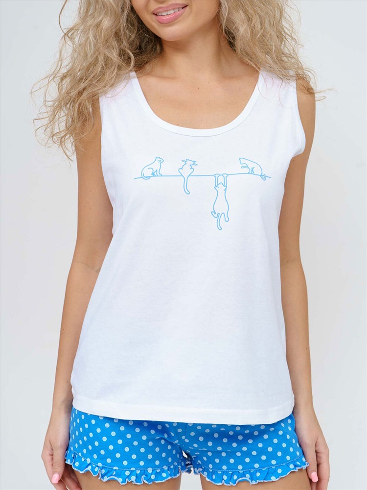 Молодежный трикотажный костюм с шортами. Майка полуприлегающего силуэта длинной до уровня бёдер, с О-образной горловиной. Шорты полуприлегающего силуэта.