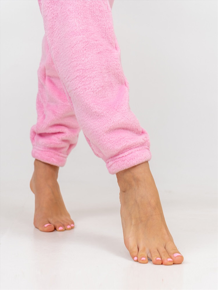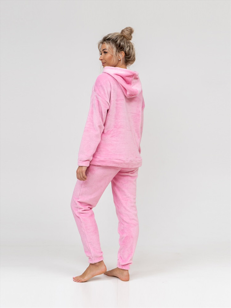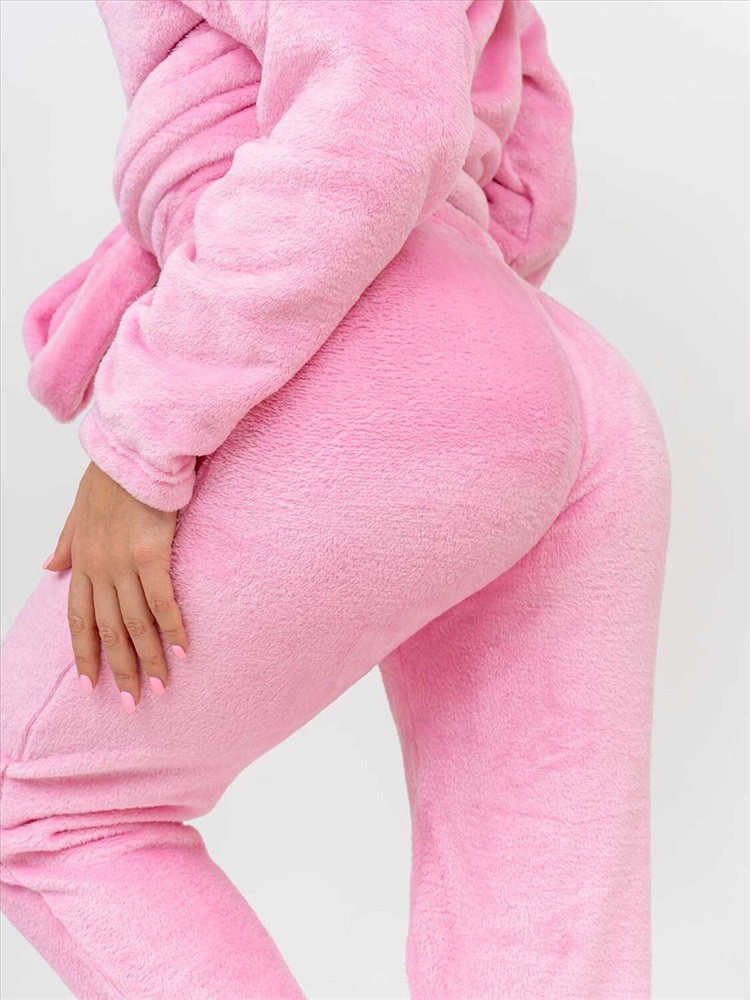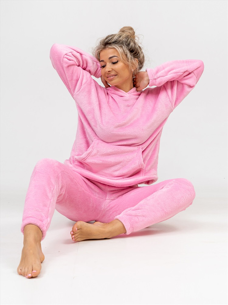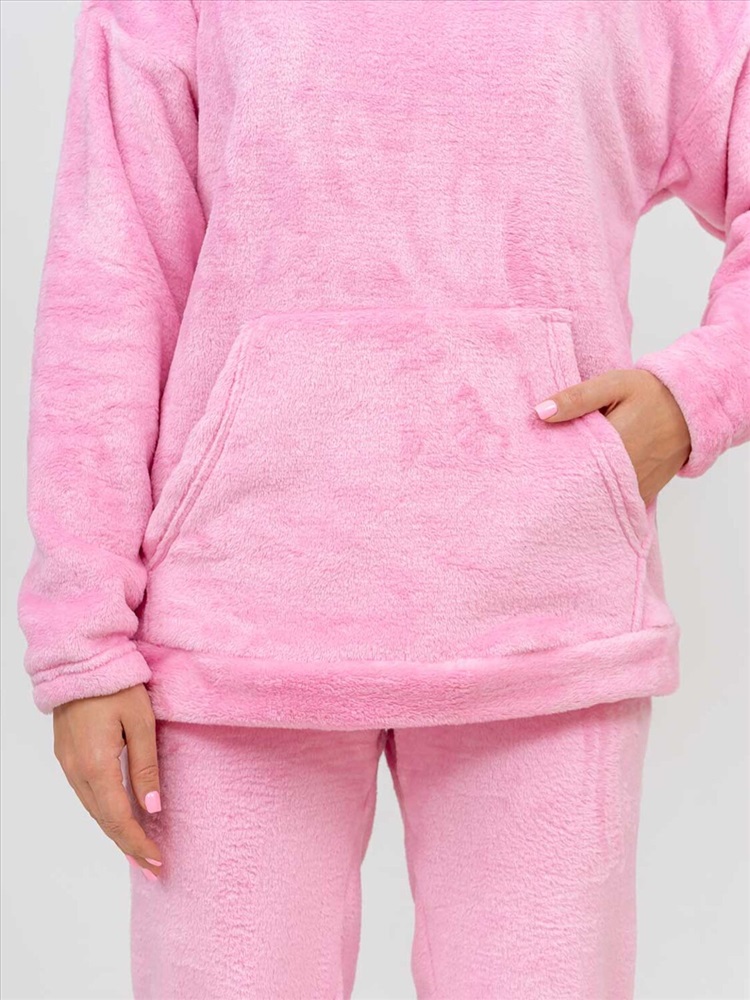 Теплый домашний костюм из приятного материала - велсофт. Толстовка с капюшоном, свободного силуэта, в стиле "oversize". Рукав - спущенный. На полочке карман - кенгуру. Нижний край толстовки обработан манжетой. Брюки свободного силуэта, с поясом на резинке и карманами с отрезным бочком.