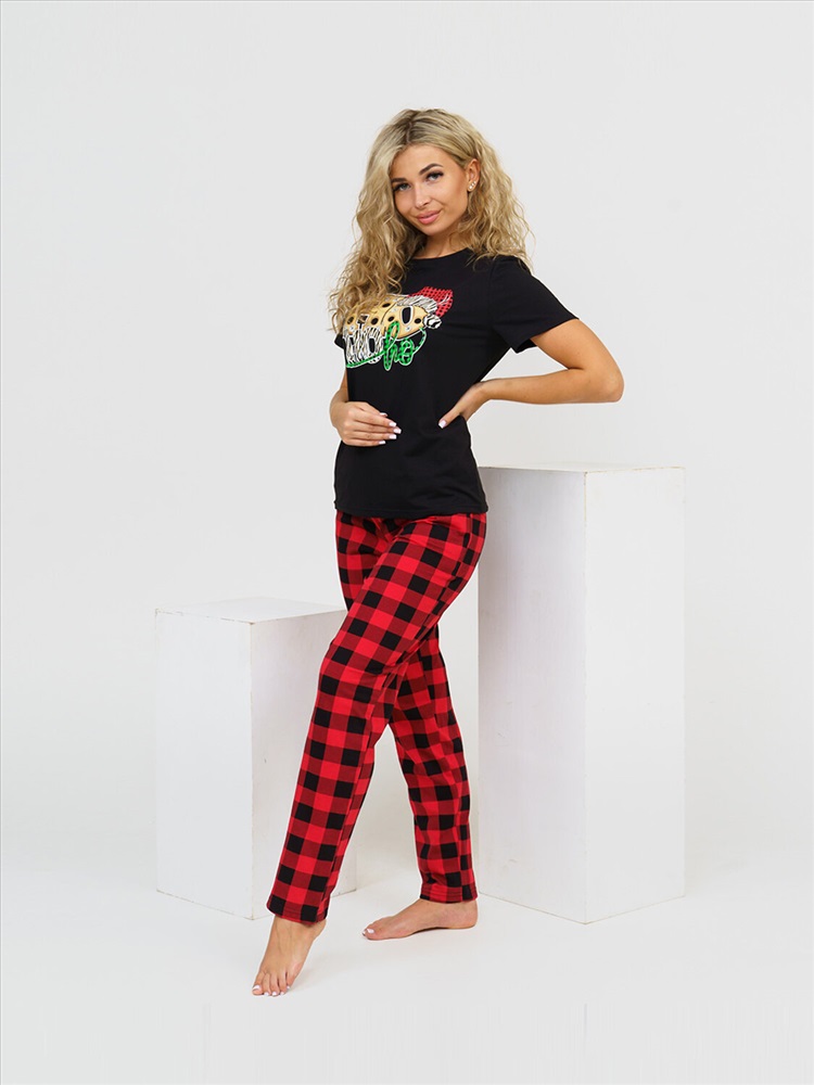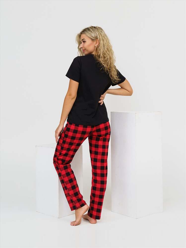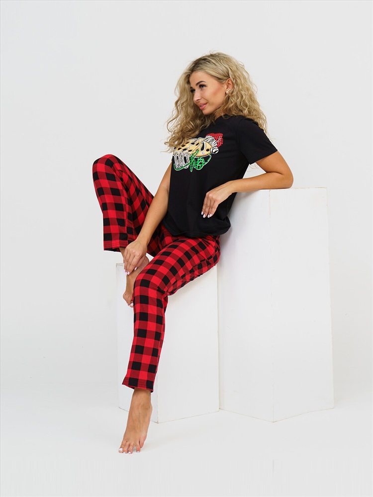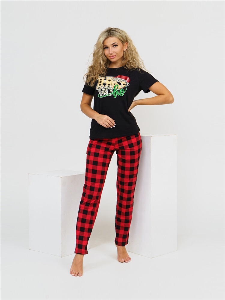 Новогодний костюм из 100% хлопка, уютный и мягкий. Милый новогодний принт не оставит никого равнодушным. Базовая черная футболка с яркой новогодней печатью, поднимет Вам настроение. Брюки на резинке с карманами будут идеальным вариантом для дома. Костюм отлично подойдет, как для повседневной носки в предновогодние дни, так и для тематической фотосессии.