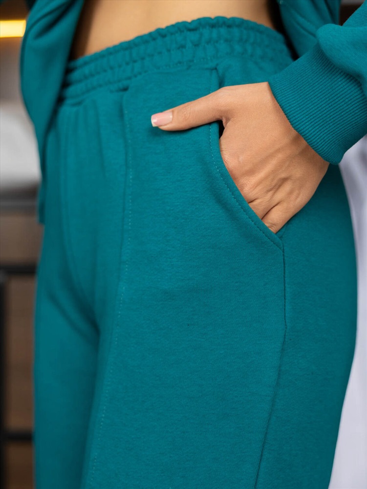 Костюм женский из качественного футера. Толстовка немного удлиненная, с воротником типа стойка и застежкой на молнию, а так же стильным принтом на груди. В нижней части боковой вырез, для максимального комфорта и свободы движения. Брюки - прямые, на манжетах, с карманами. Пояс на резинке, для надежной фиксации. Стильный, легкий вариант на каждый день.