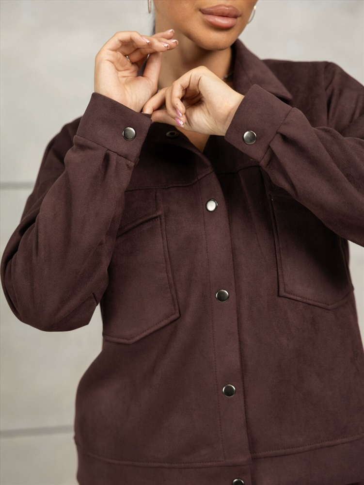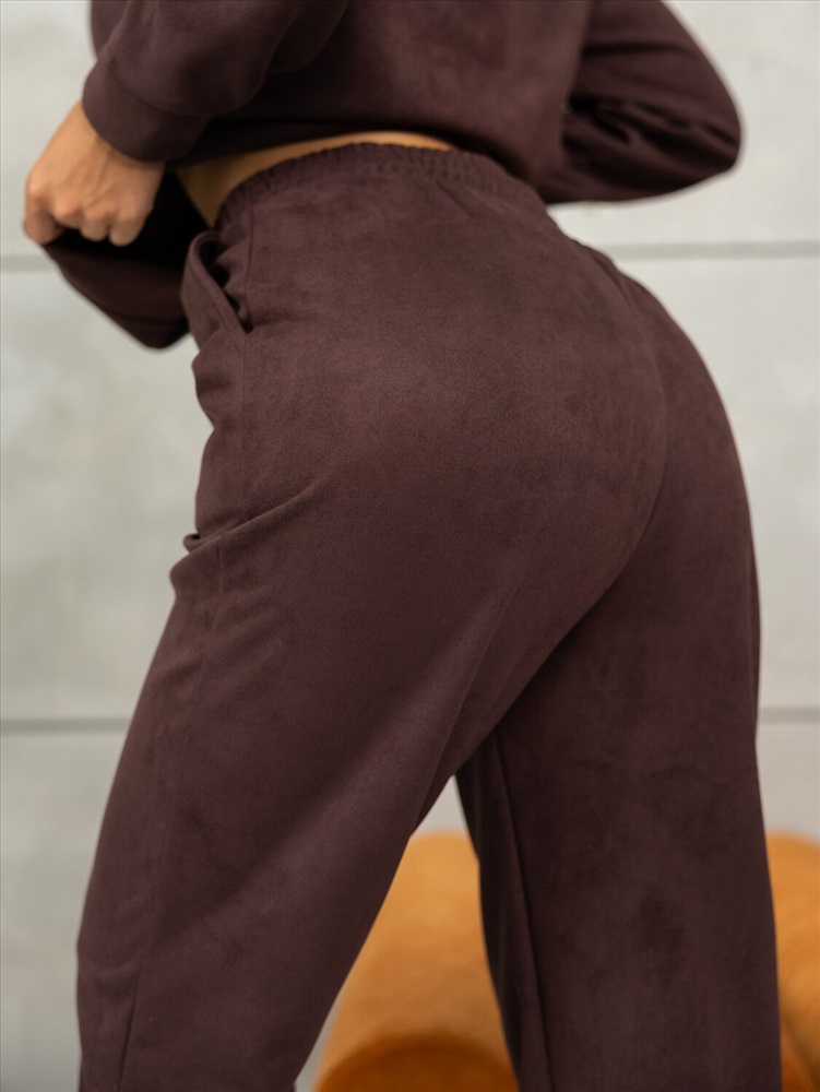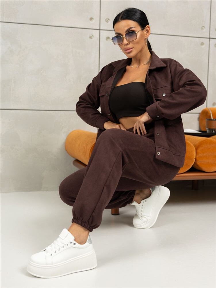 Костюм женский из мягкой, приятной замши. Тренд сезона. Куртка с длинным рукавом, на манжетах. Укомплектована удобными застежками на кнопках. Стильный отложный воротник и накладные карманы делают данную модель еще более эффектной и привлекающей взгляды. Удобные брюки на манжетах, с поясом на резинке и боковыми карманами.