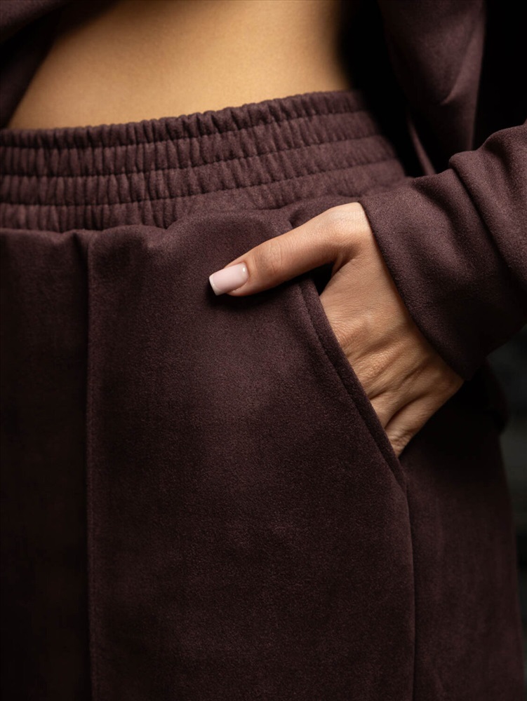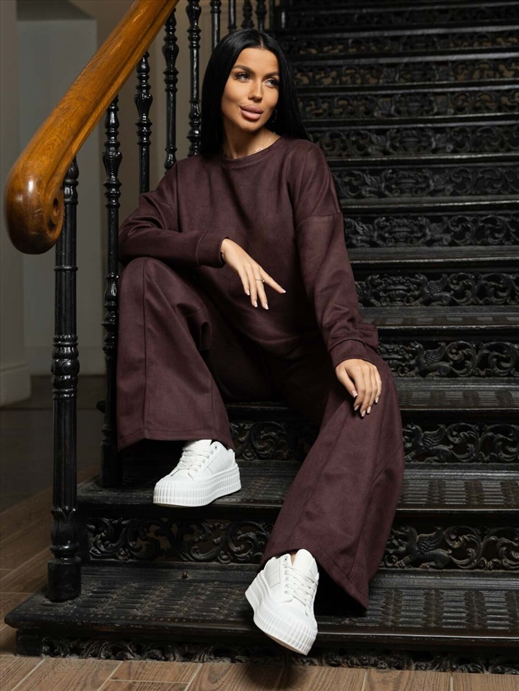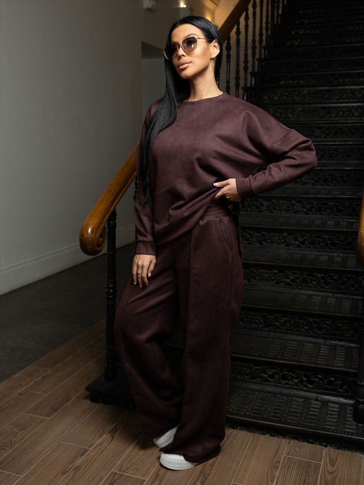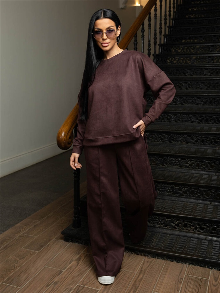 Почувствуйте себя королевой комфорта и стиля с нашим новым брючным костюмом! Двойка выполнена из мягкой и приятной на ощупь замши – прекрасный выбор на весну и осень. Оверсайз крой свитшота скрывает недостатки фигуры, разрезы по бокам и удлиненная спинка придают изюминку образу. А свободные штаны палаццо со стрелками – настоящая находка для современной девушки. Качественная одежда в стиле спорт-шик дарит уверенность себе и отличное настроение!