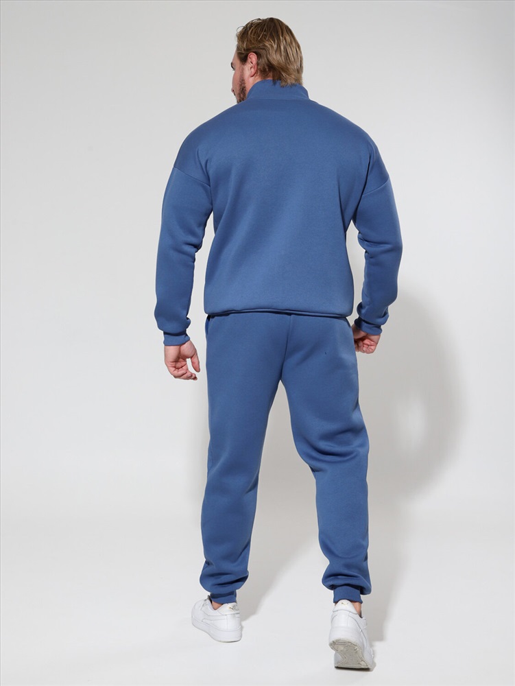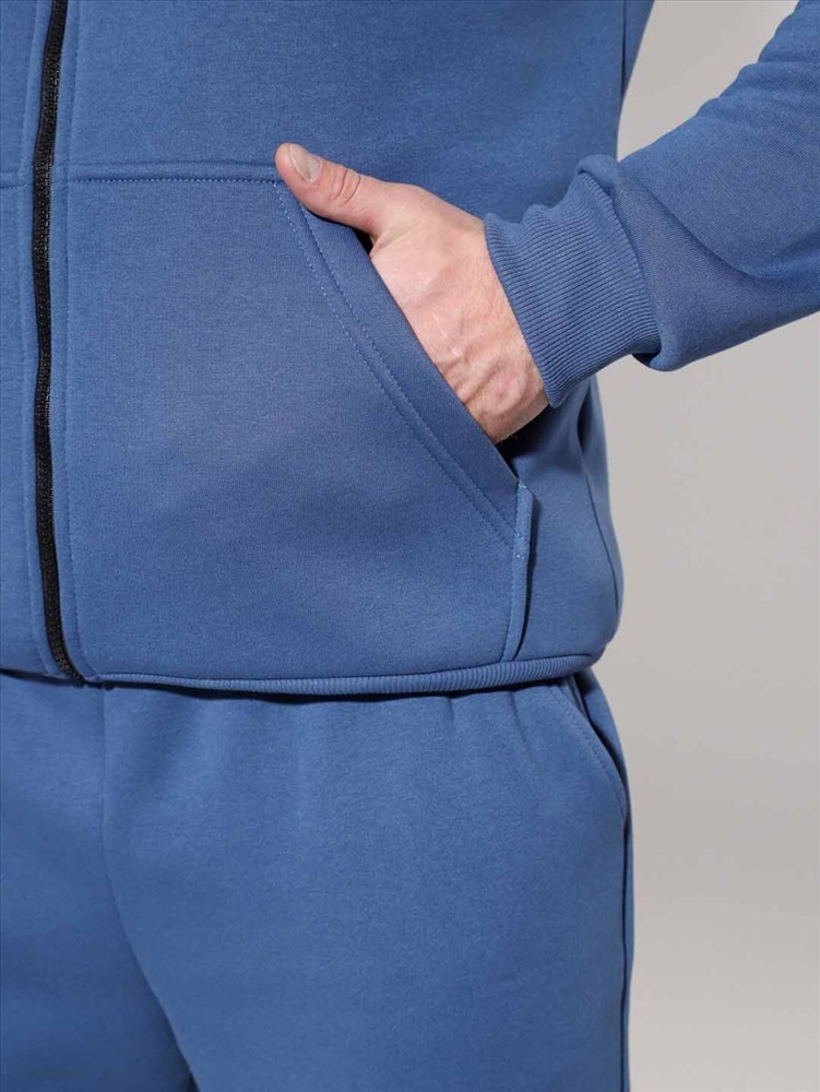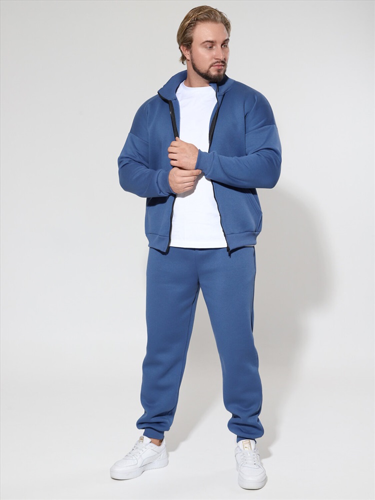 Утепленный мужской костюм из футера с начесом, с крашением варенка. Толстовка с высоким горлом на молнии, карманом кенгуру и манжетами из кашкорсе по низу рукавов и кофты. Брюки джоггеры с карманами в боковых швах, поясом на резинке с несколькими отстрочками и манжетами из кашкорсе по низу брюк.