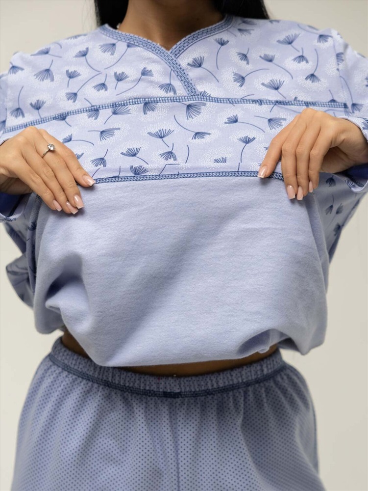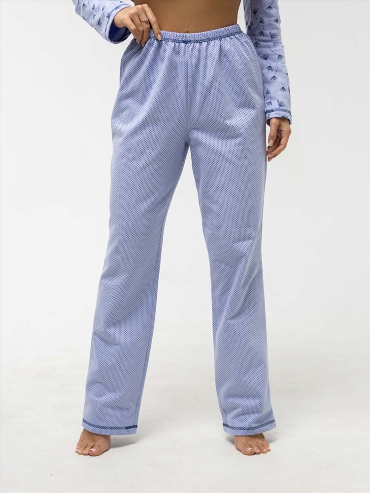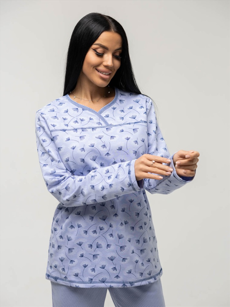 Женская пижама из приятной трикотажной ткани с мягким начесом. Отличный комплект для сна и отдыха, в нем Вы будете засыпать с комфортом. Пижама выполнена из тканей компаньонов, которые идеально подходят друг другу. Верх свободный, не сковывает движения, с кокеткой на запах. Брюки свободного силуэта, полноценной длины, без карманов.
