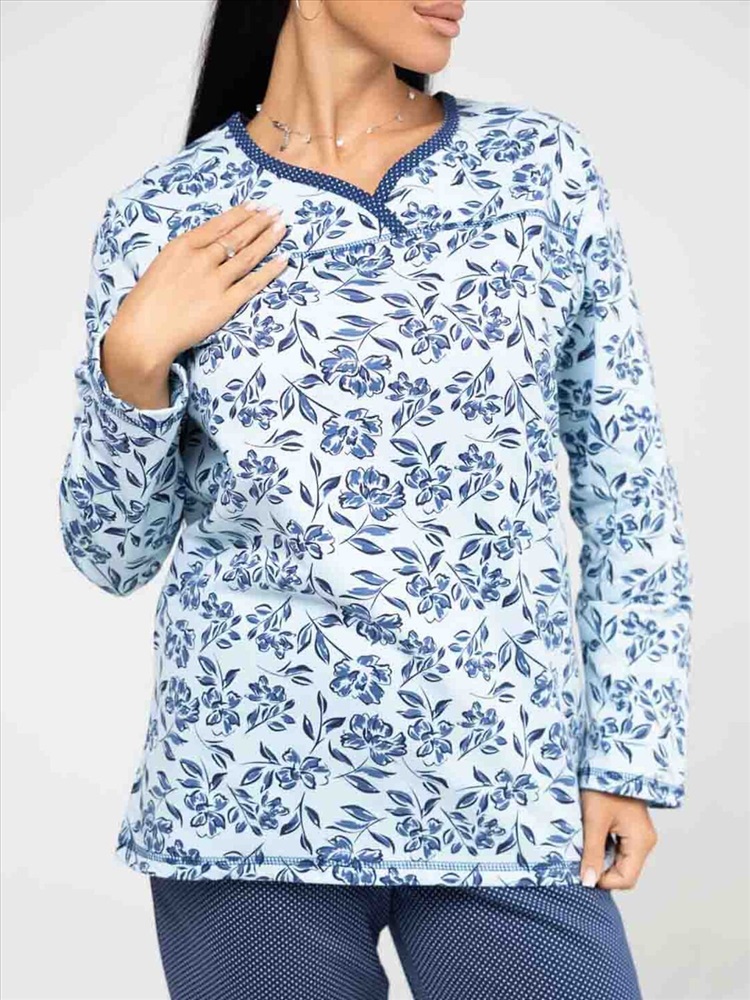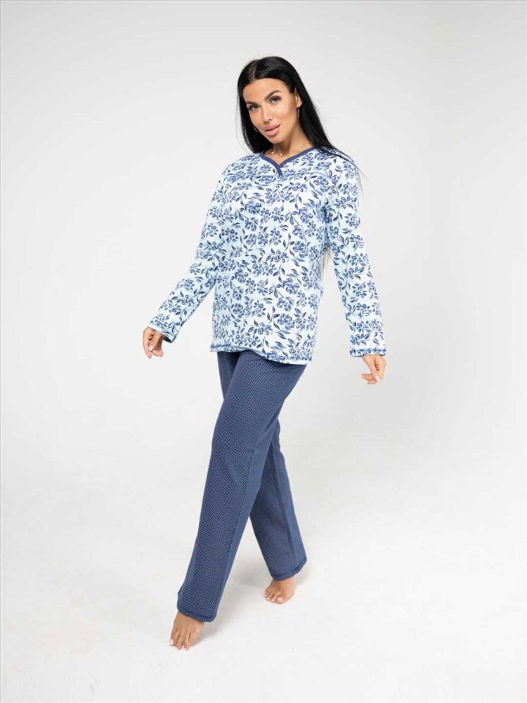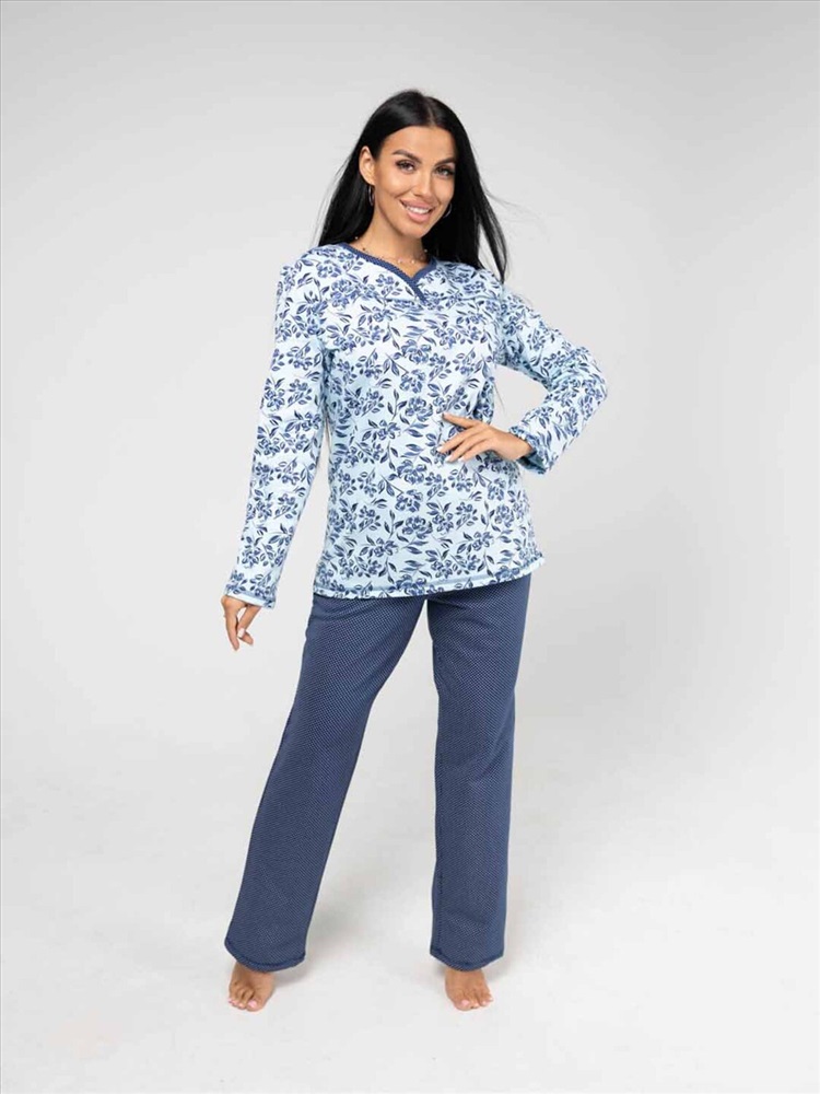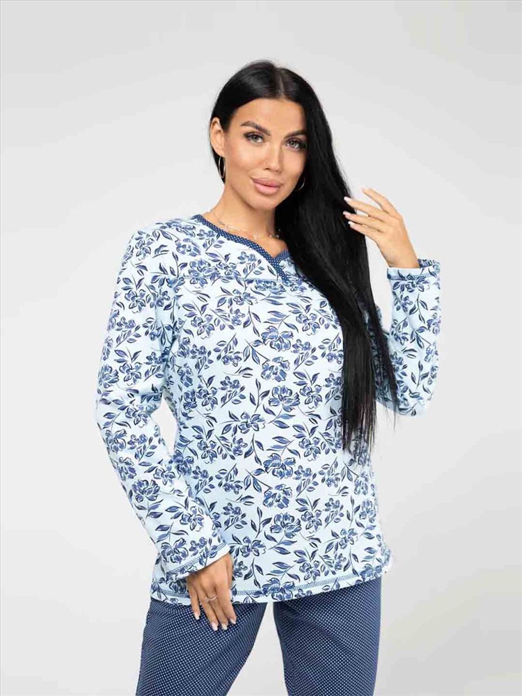 Женская пижама из приятной трикотажной ткани с мягким начесом. Отличный комплект для сна и отдыха, в нем Вы будете засыпать с комфортом. Пижама выполнена из тканей компаньонов, которые идеально подходят друг другу. Верх свободного силуэта, не сковывает движения, с кокеткой на запах. Брюки свободного силуэта, полноценной длины, без карманов.