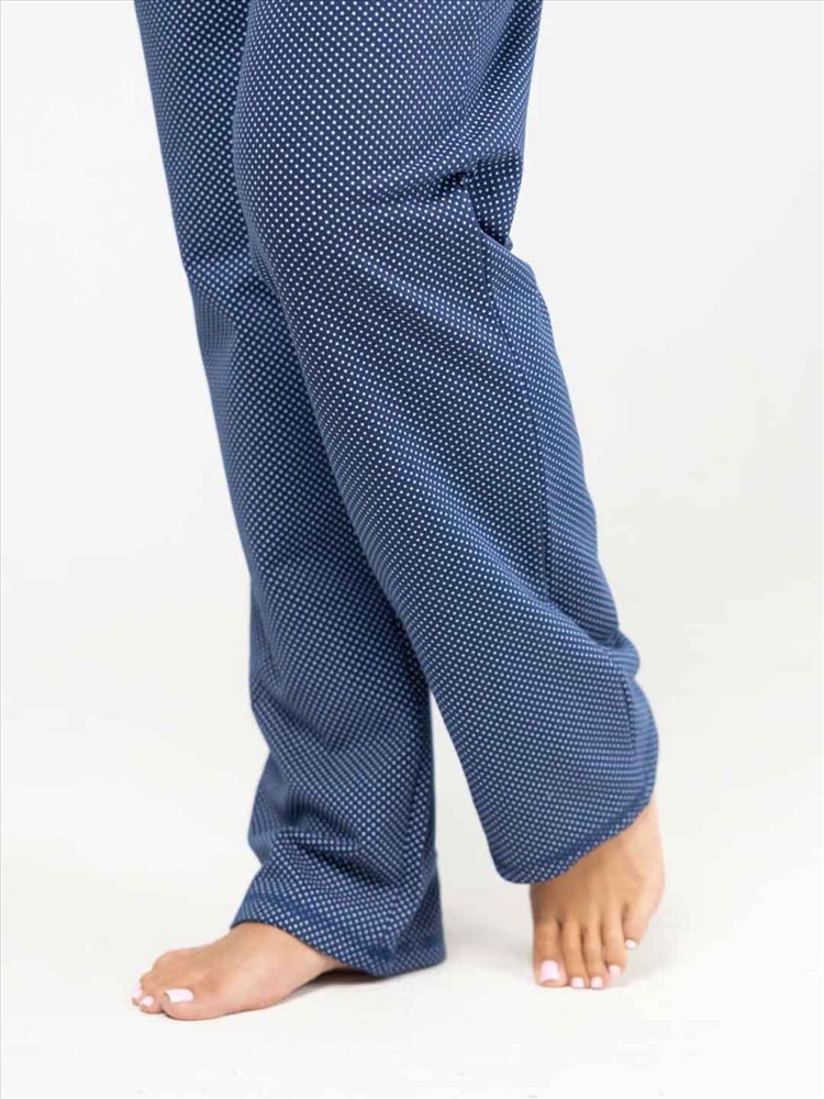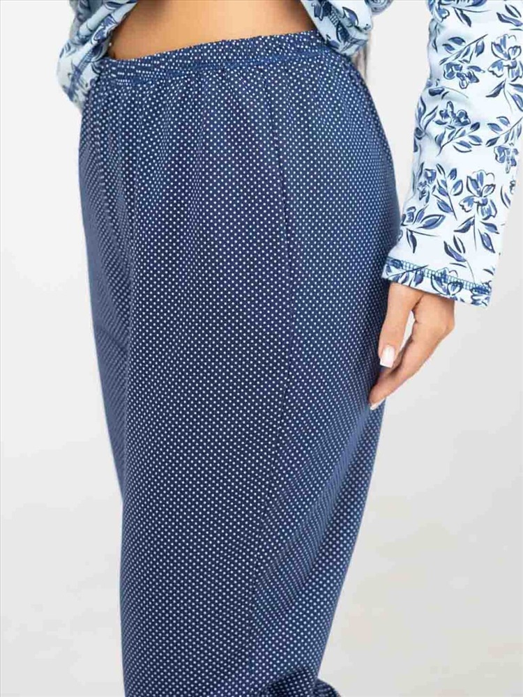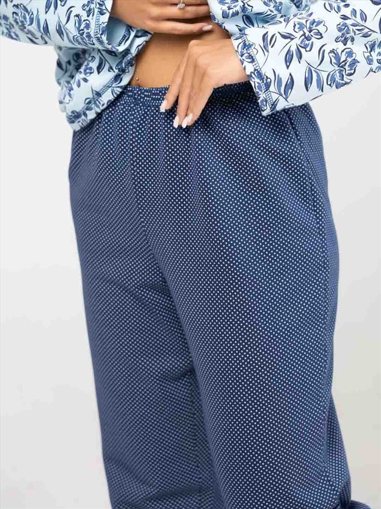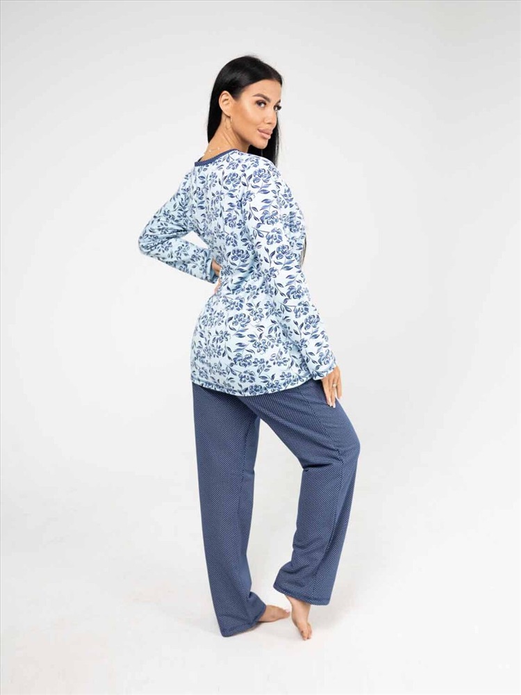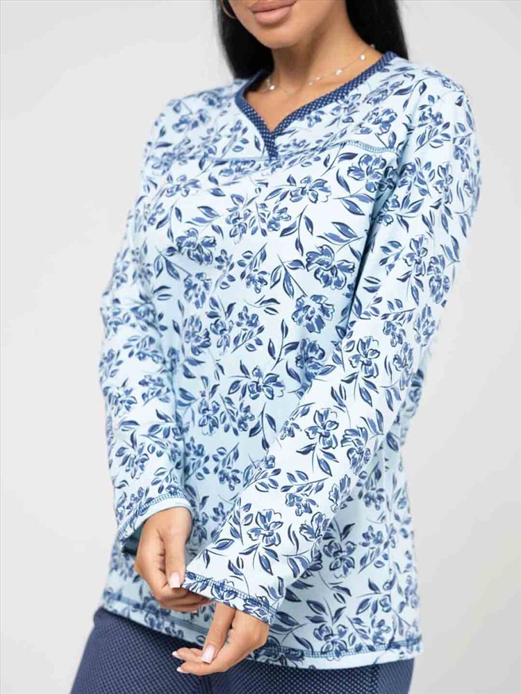 Женская пижама из приятной трикотажной ткани с мягким начесом. Отличный комплект для сна и отдыха, в нем Вы будете засыпать с комфортом. Пижама выполнена из тканей компаньонов, которые идеально подходят друг другу. Верх свободного силуэта, не сковывает движения, с кокеткой на запах. Брюки свободного силуэта, полноценной длины, без карманов.