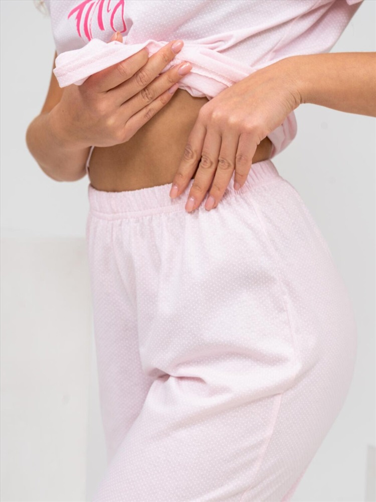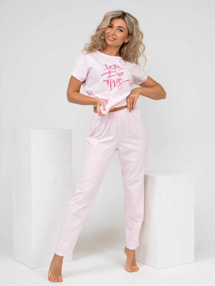 Женская пижама со штанами выполнена из мягкого и качественного 100% хлопка. Ткань гиппоаллергенна и поэтому идеально подходит, не вызывает аллергических реакций и раздражений нежной кожи. Пижама женская имеет следующий комплект: футболка свободного кроя с яркой печатью и пижамные брюки на мягкой резинке. Пижама женская со штанами удобная и практичная одежда для дома, идеально подойдет для сна, пижамной вечеринки и повседневной носки по дому.