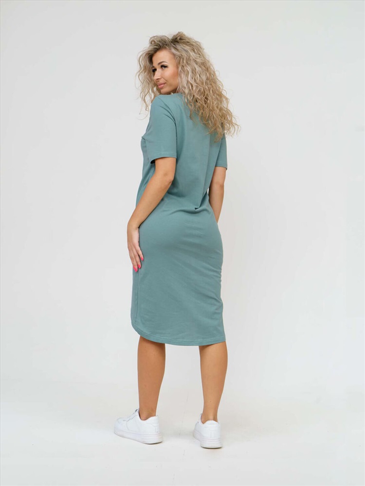 Платье свободной силуэтной формы с О-образной горловиной, коротким втачным рукавом, карманами в боковых швах и ассимметричной линий низа. На полочке печатный рисунок.