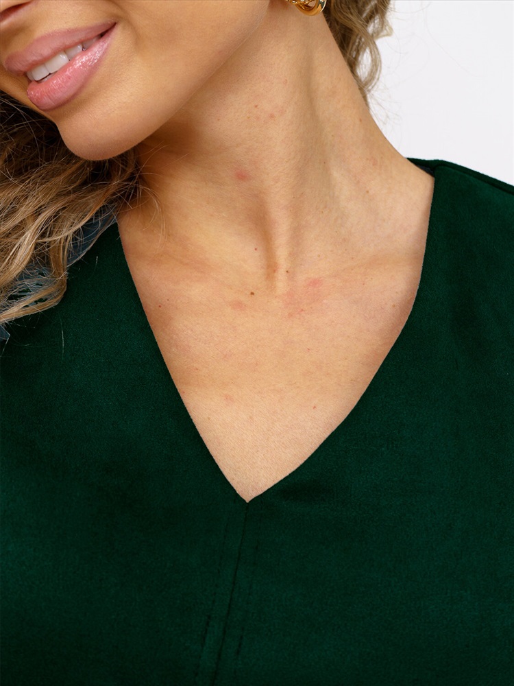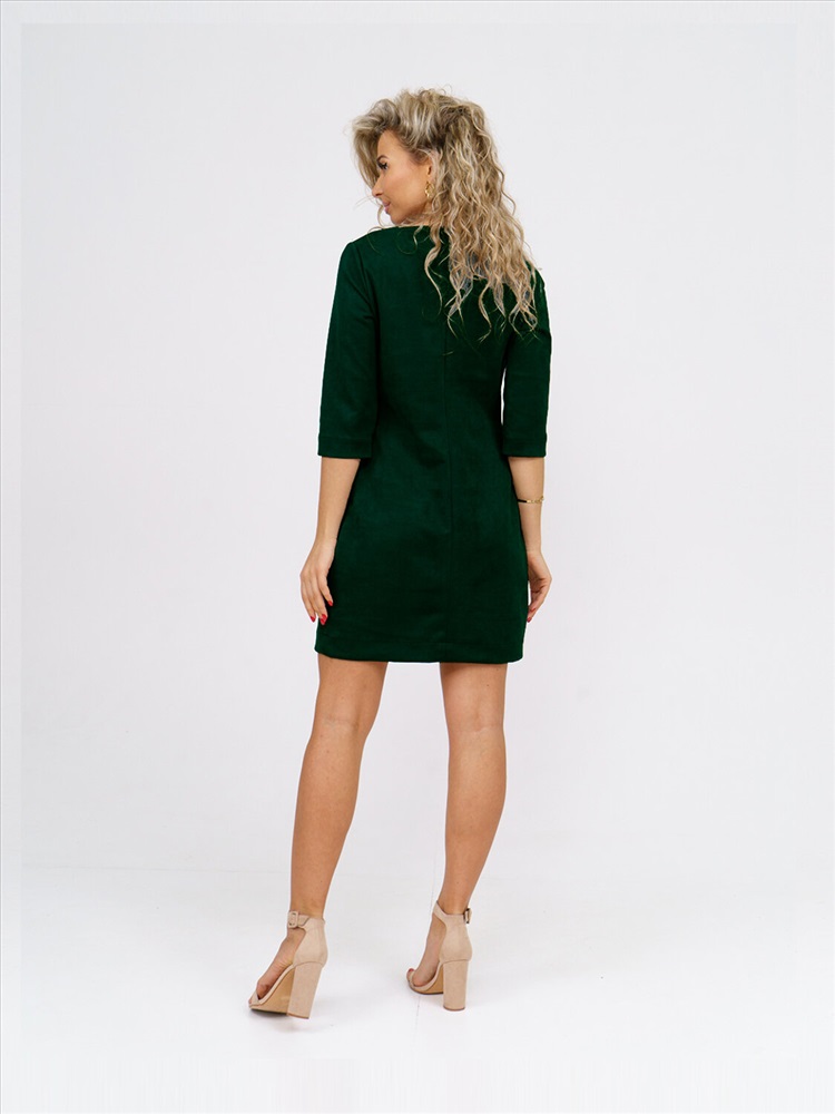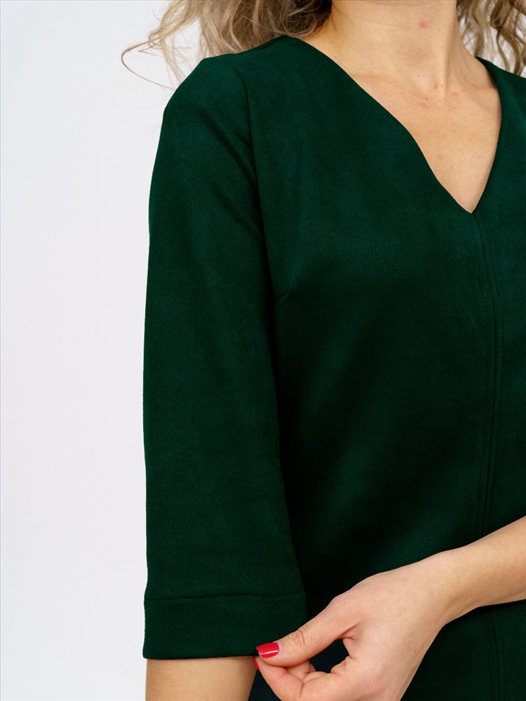 Платье прилегающего силуэта, из искуственной замши, длиной до середины бедра, с V-образной горловиной и рукавом 3/4.Платье отлично впишется в повседневный гардероб, иделально будет смотреться с массивными ботинками, либо с ботфортами.