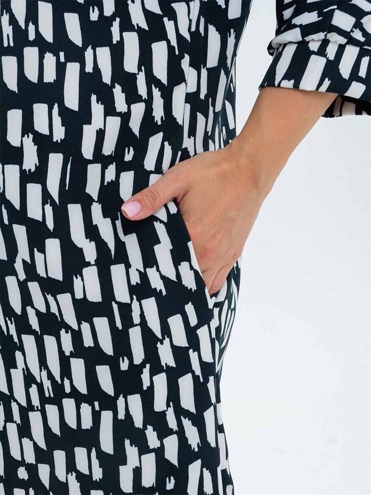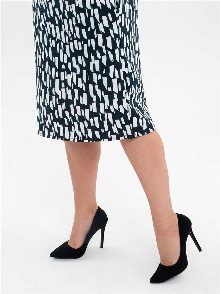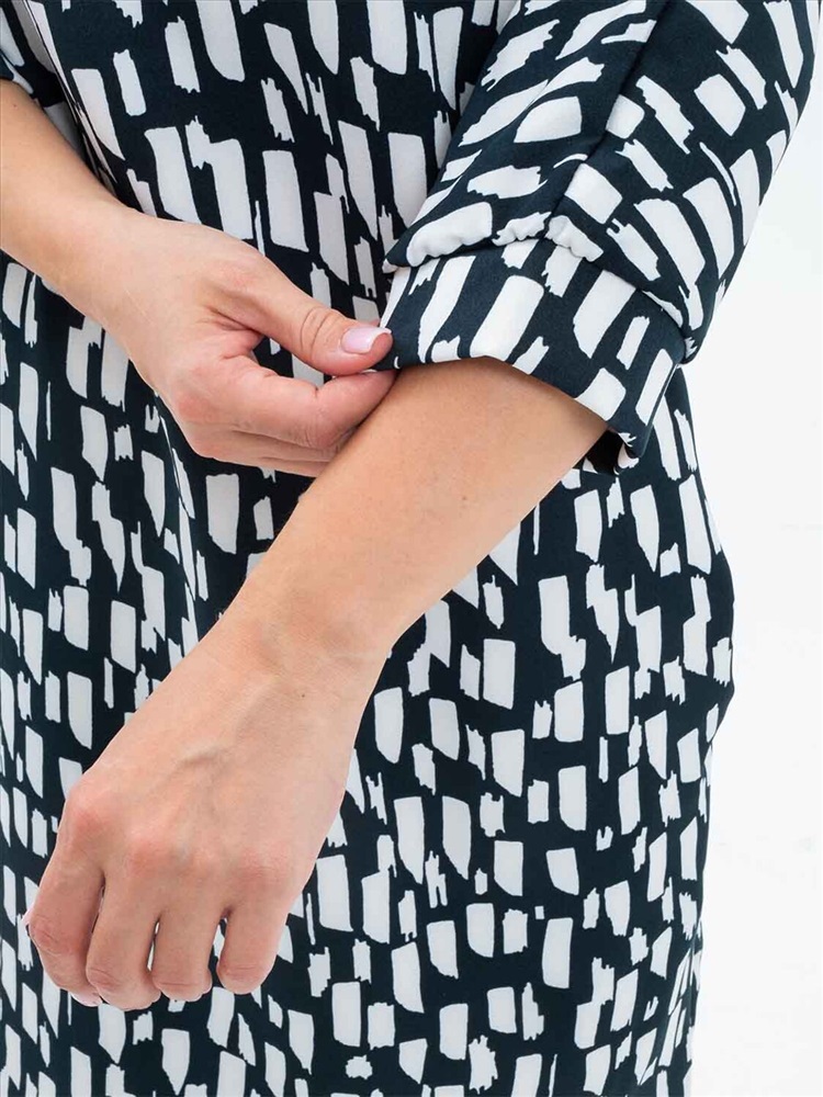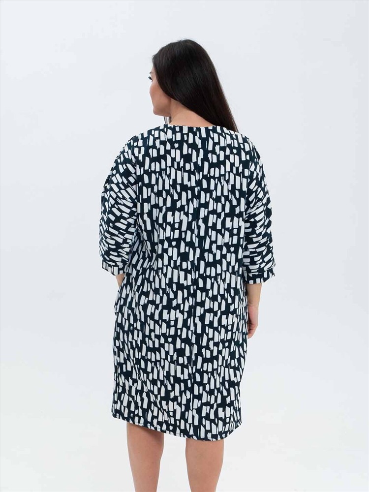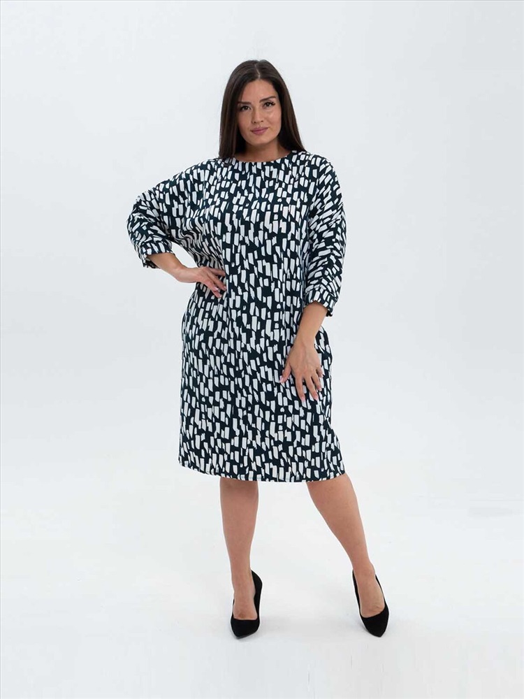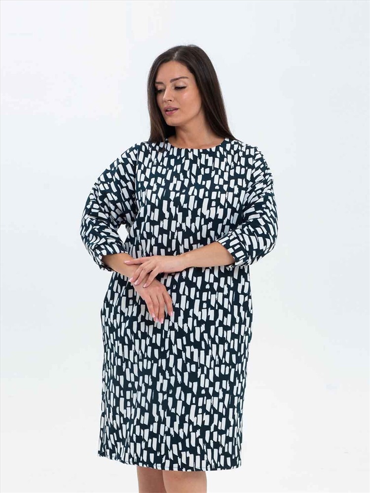 Платье женское полуприлегающего силуэта из трикотажного полотна «Барби» длинной до уровня колена. Рукав базового покроя длинной три четверти. Вырез горловины О-образный.