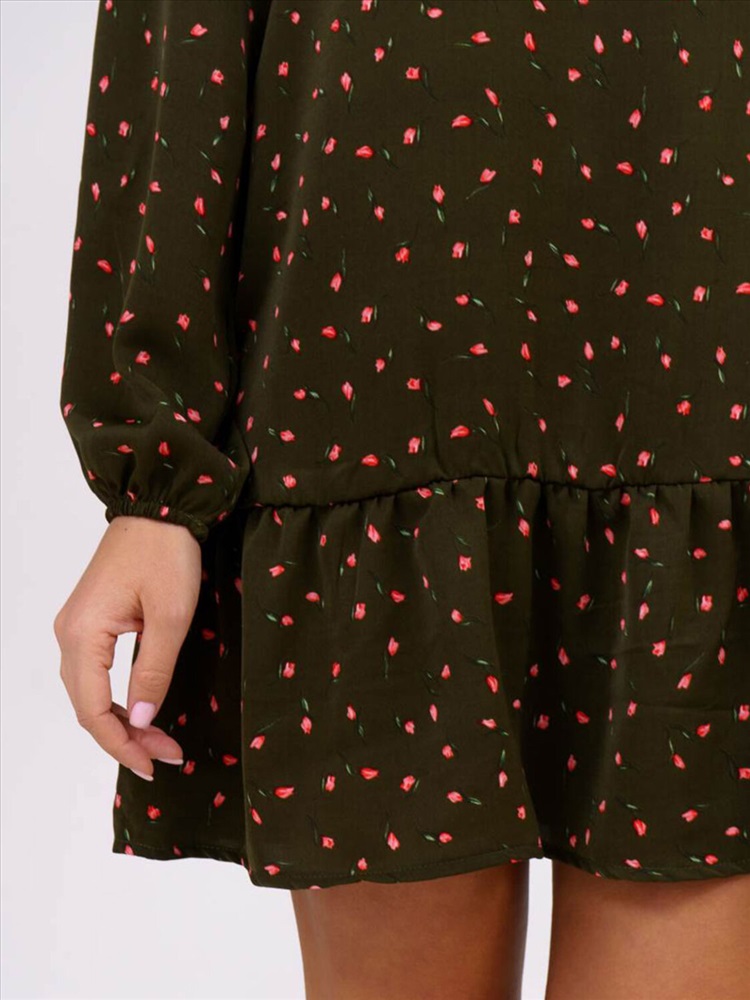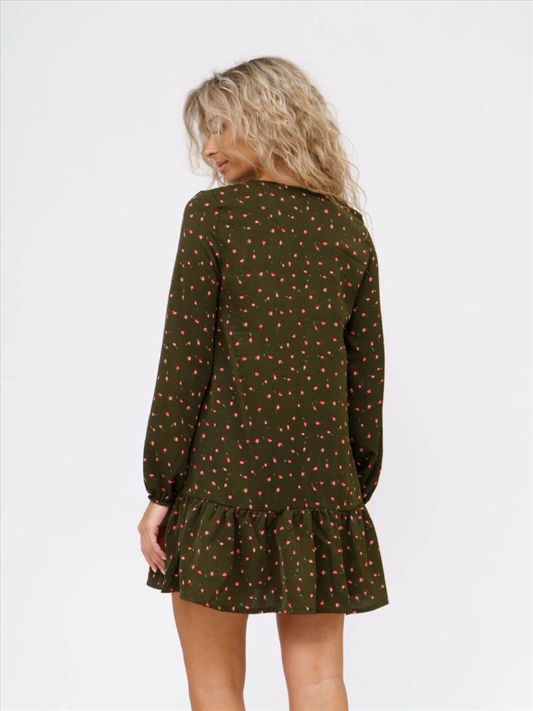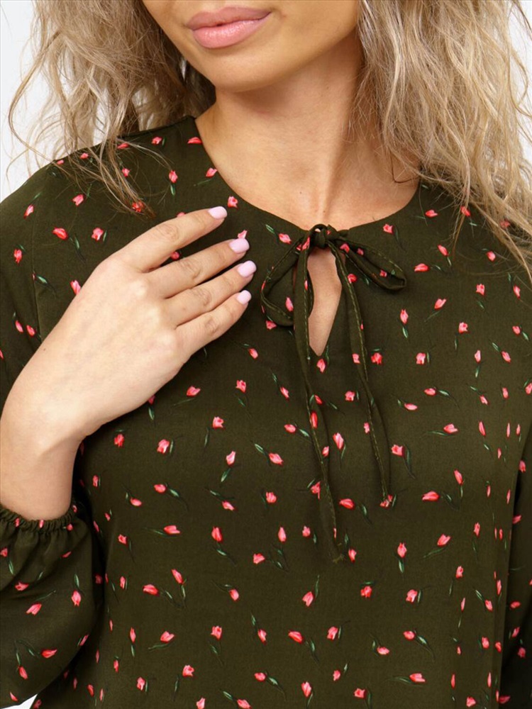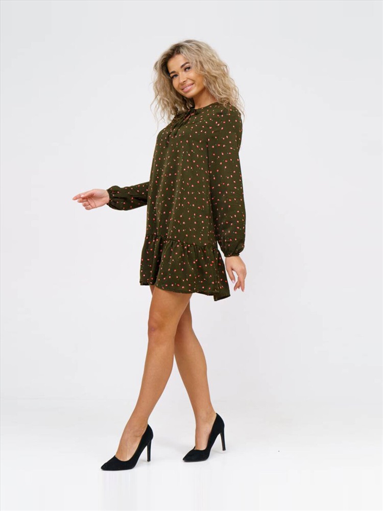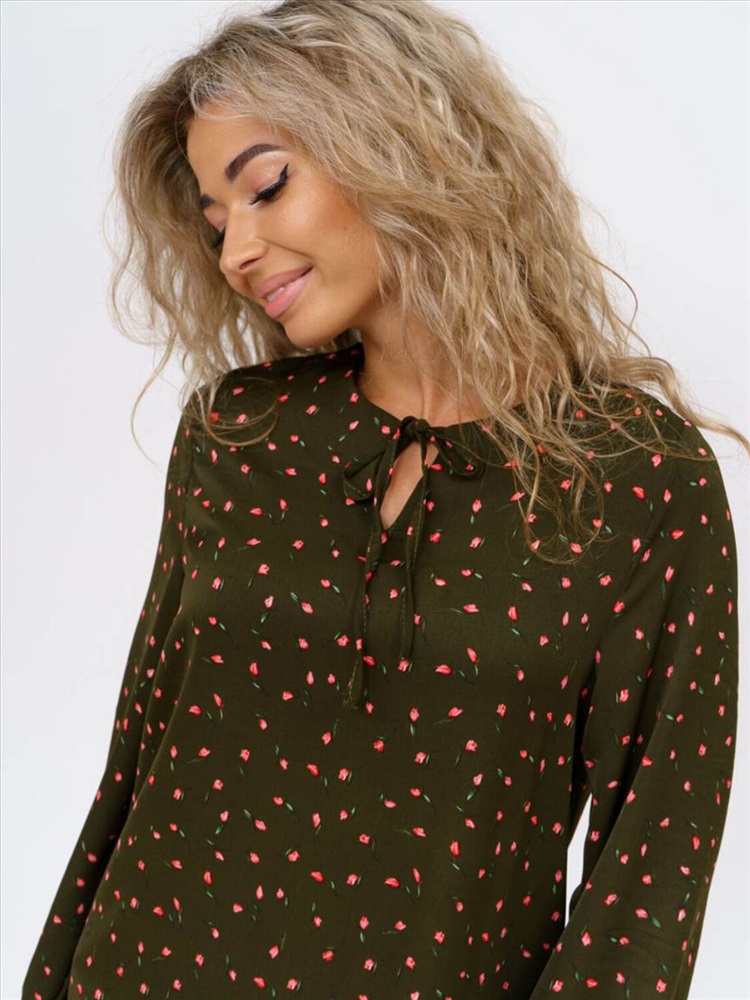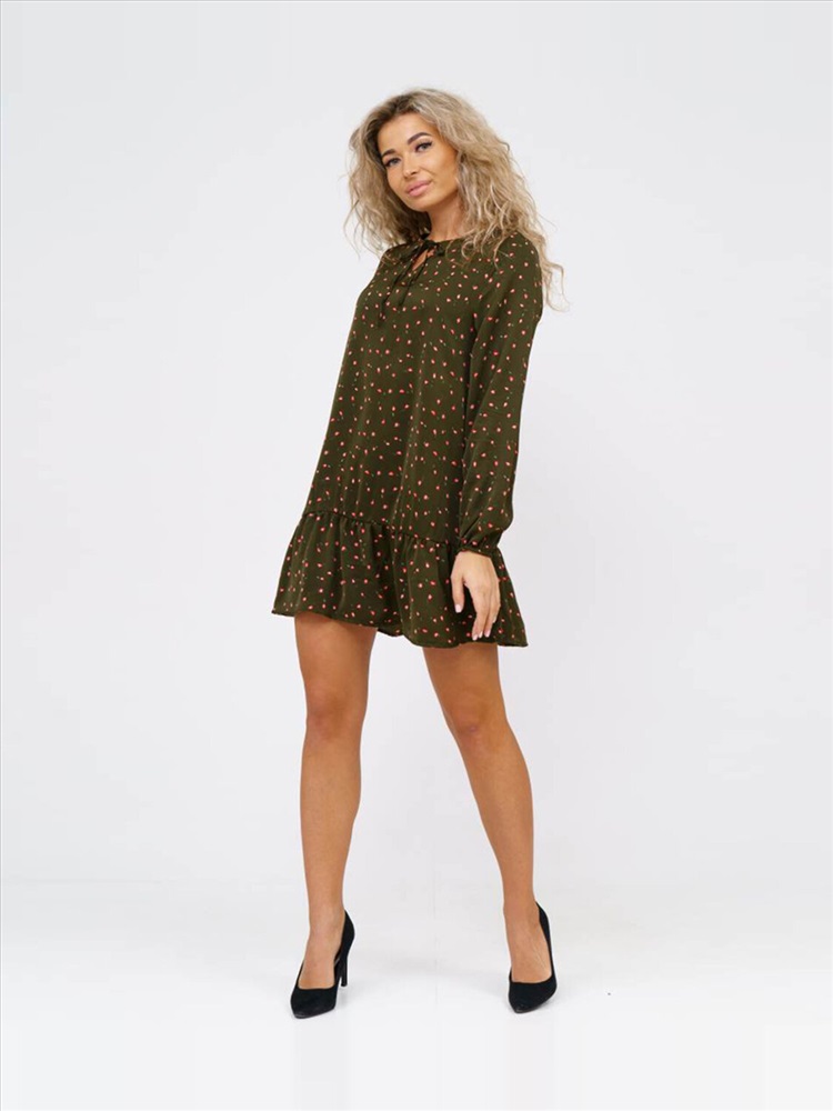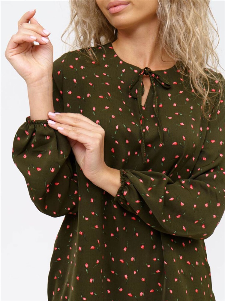 Женское платье из легкой ткани, свободного силуэта с воланом по низу изделия, длинным рукавом, округлой горловиной с завязками. Наше платье отлично будет смотреться как с кедами и сумкой кросс-боди, так и с туфлями на каблуке и широким ремнем.