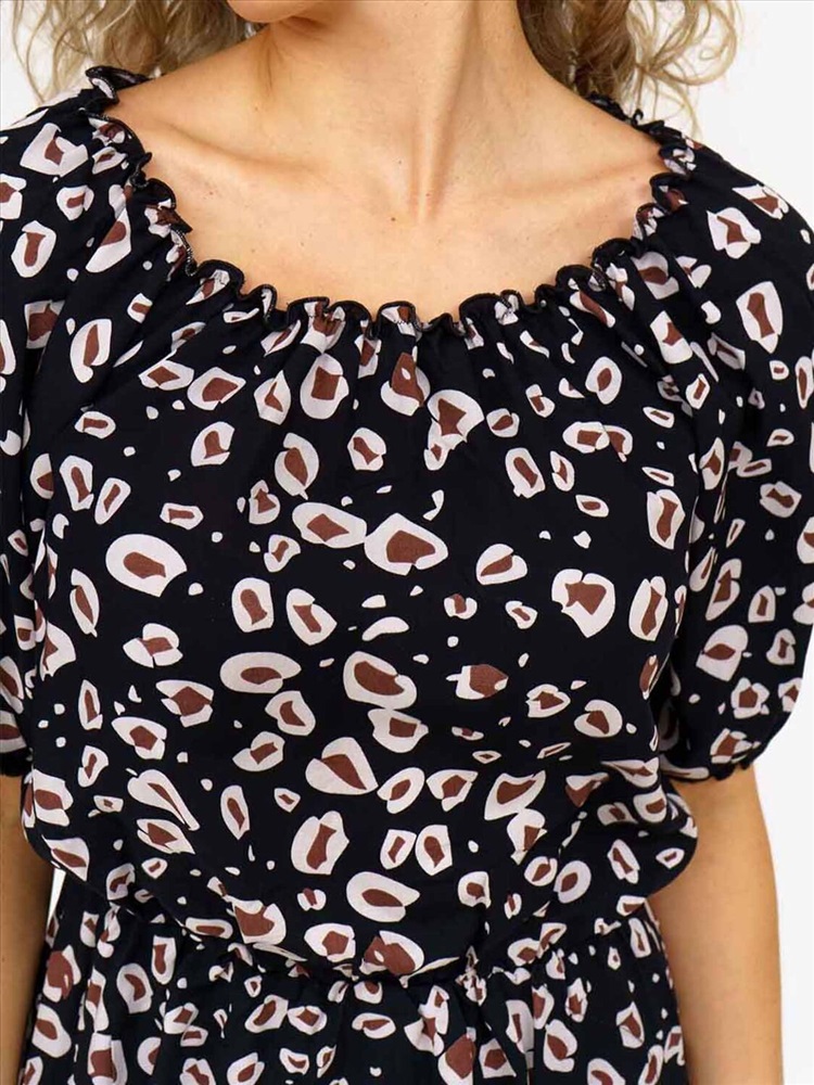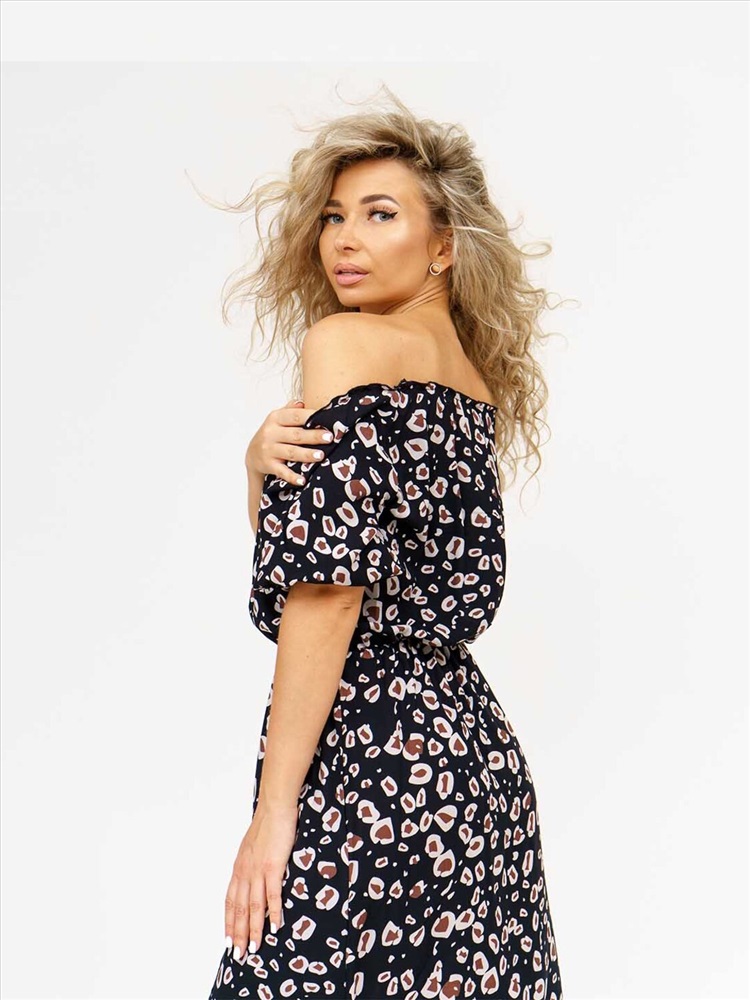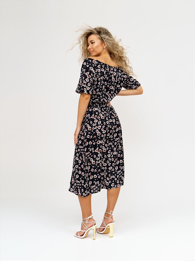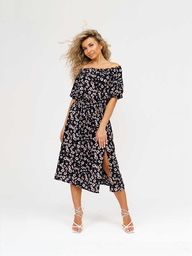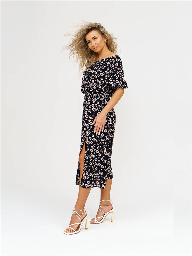 Платье женское с резинкой по горловине и талии, рукав фонарик, юбка с высоким разрезом по ноге, длиной миди. Женское платье из штапеля незаменимо в летнее, весеннее и осеннее время года. Такая модель смотрится прекрасно на любой фигуре, скрывает недостатки и подчеркивая талию. Платье легко комбинируется с любой другой одеждой: косухой, джинсовкой, тренчем.