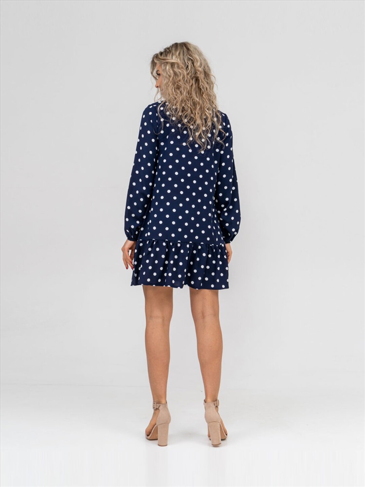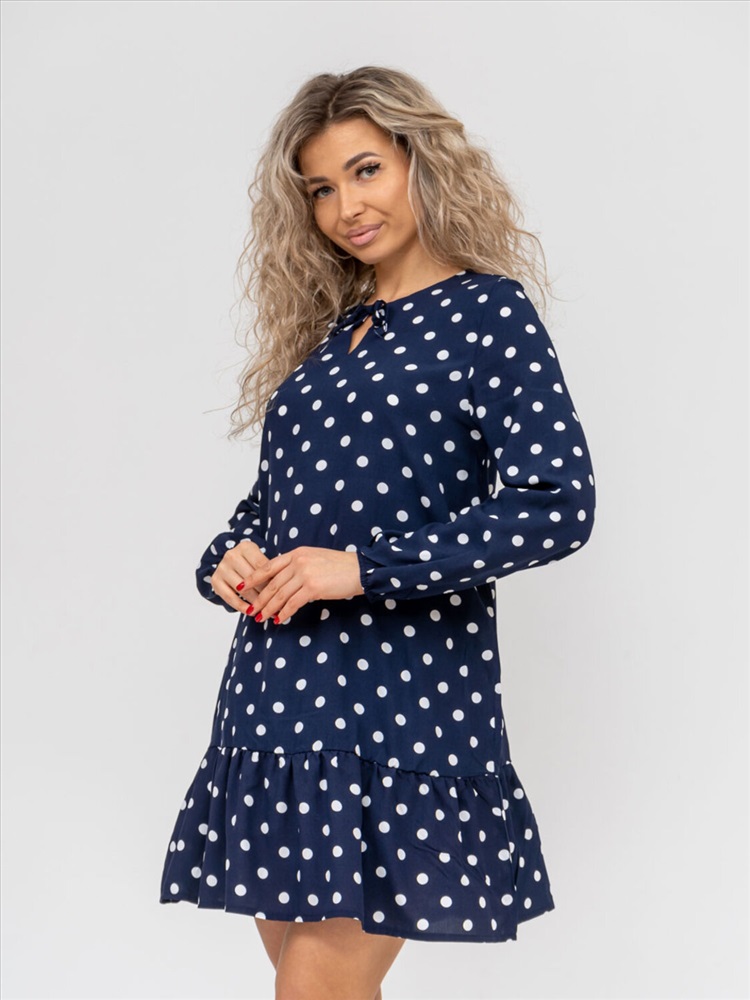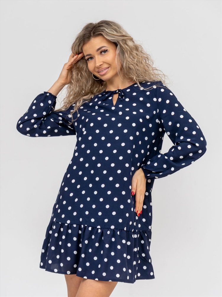 Женское платье из легкой ткани, свободного силуэта с воланом по низу изделия, длинным рукавом, округлой горловиной с завязками. Наше платье отлично будет смотреться как с кедами и сумкой кросс-боди, так и с туфлями на каблуке и широким ремнем.