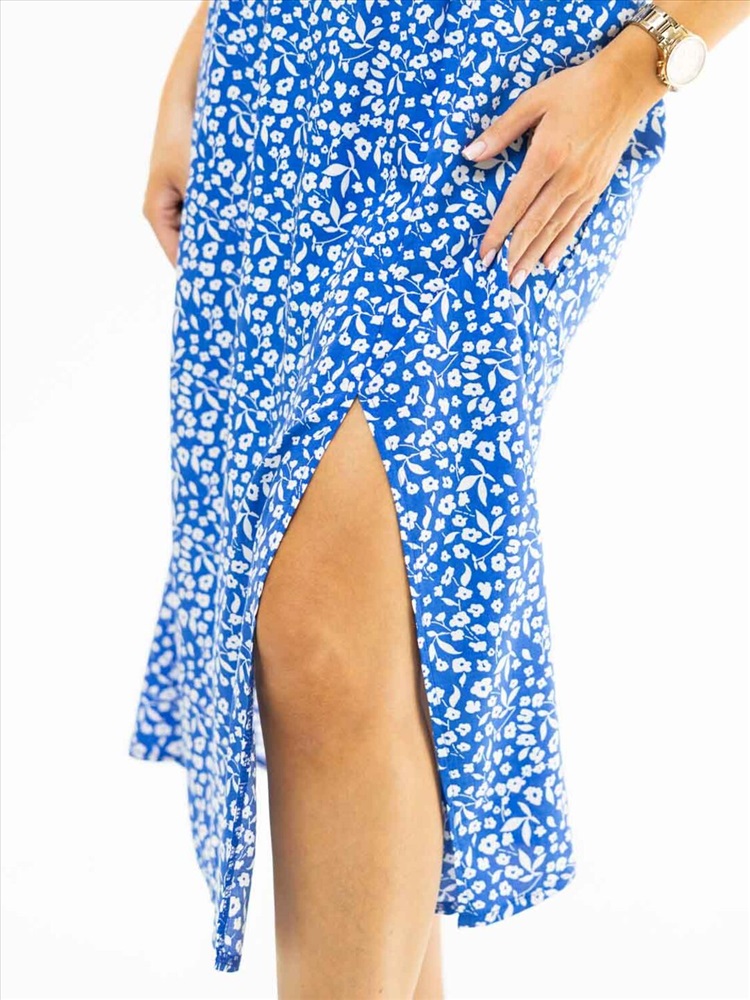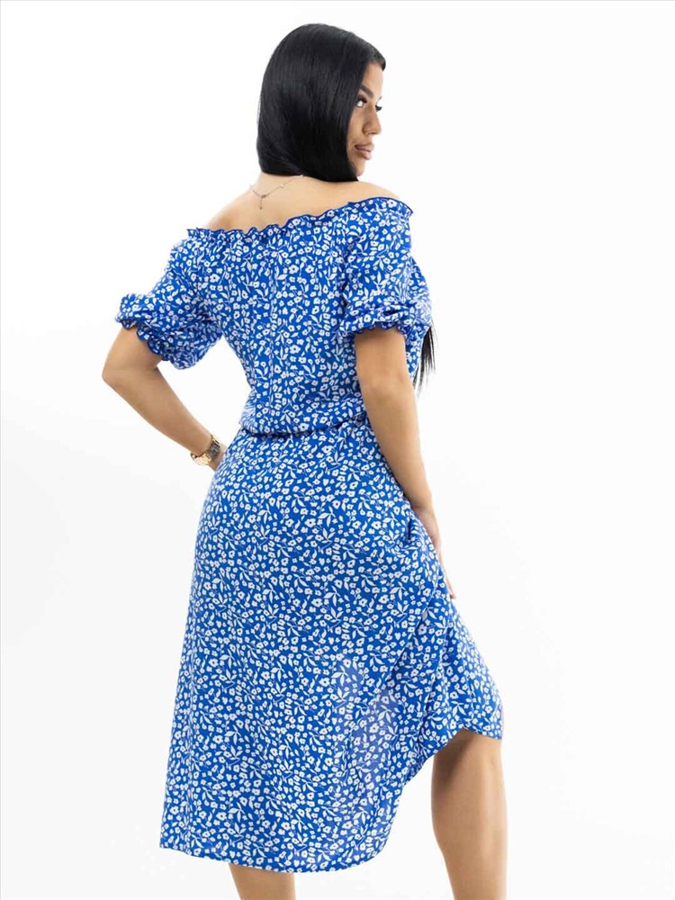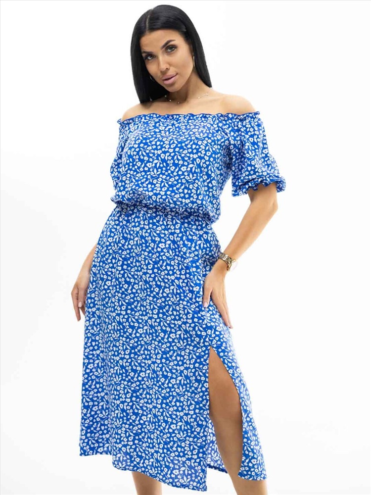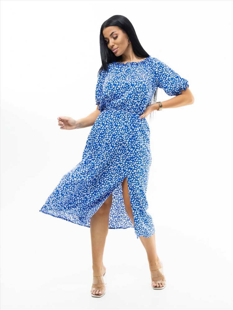 Платье женское с резинкой по горловине и талии, рукав фонарик, юбка с высоким разрезом по ноге, длиной миди. Женское платье из штапеля незаменимо в летнее, весеннее и осеннее время года. Такая модель смотрится прекрасно на любой фигуре, скрывает недостатки и подчеркивая талию. Платье легко комбинируется с любой другой одеждой: косухой, джинсовкой, тренчем.