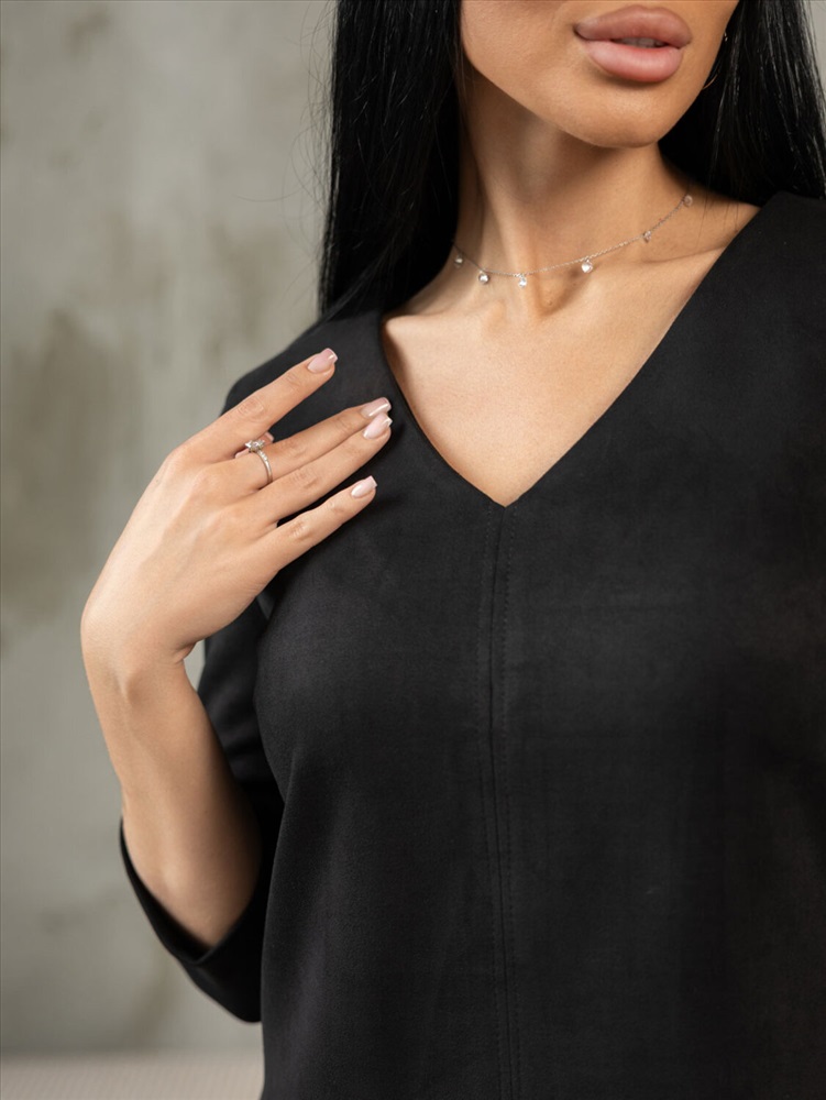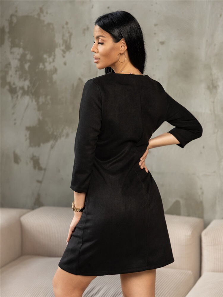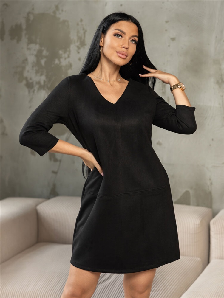 Платье прилегающего силуэта, из искуственной замши, длиной до середины бедра, с V-образной горловиной и рукавом 3/4.Платье отлично впишется в повседневный гардероб, иделально будет смотреться с массивными ботинками, либо с ботфортами.