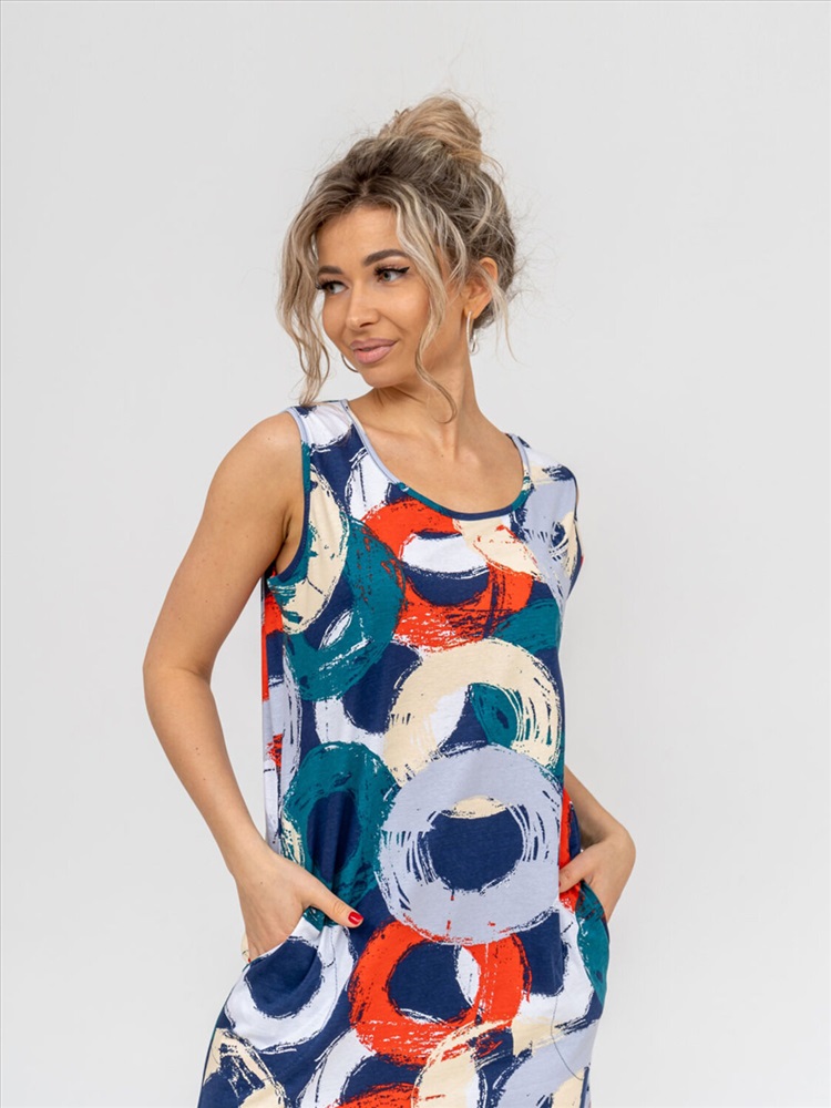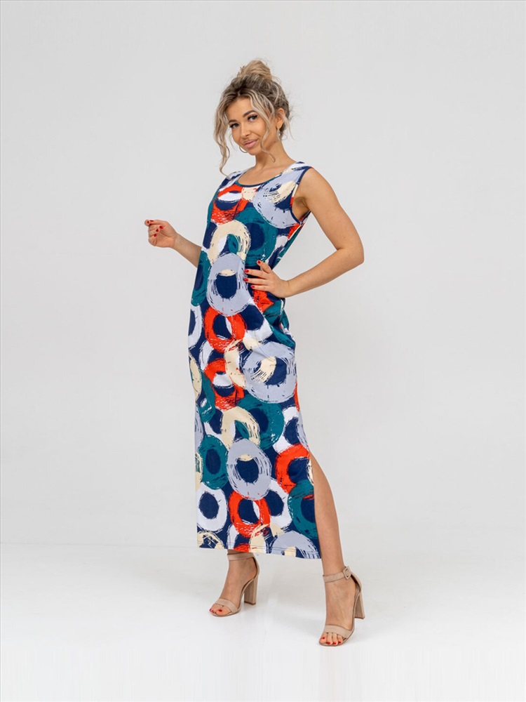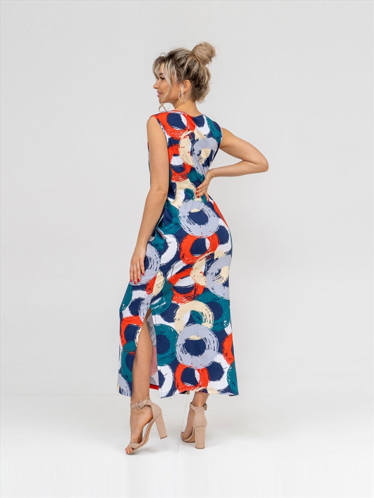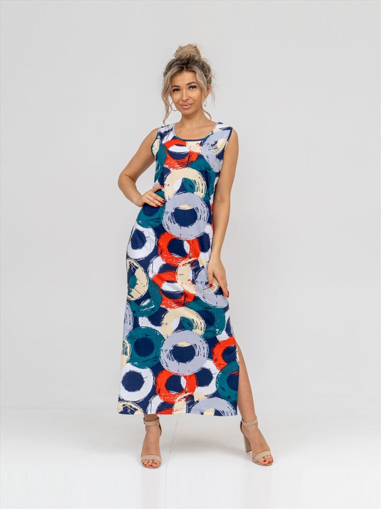 Сарафан женский прилегающего силуэта, длиной до уровня лодыжки. Вырез горловины - лодочка. Без рукавов. Есть карманы с отрезным бочком. Нижняя часть сарафана имеет вырез.