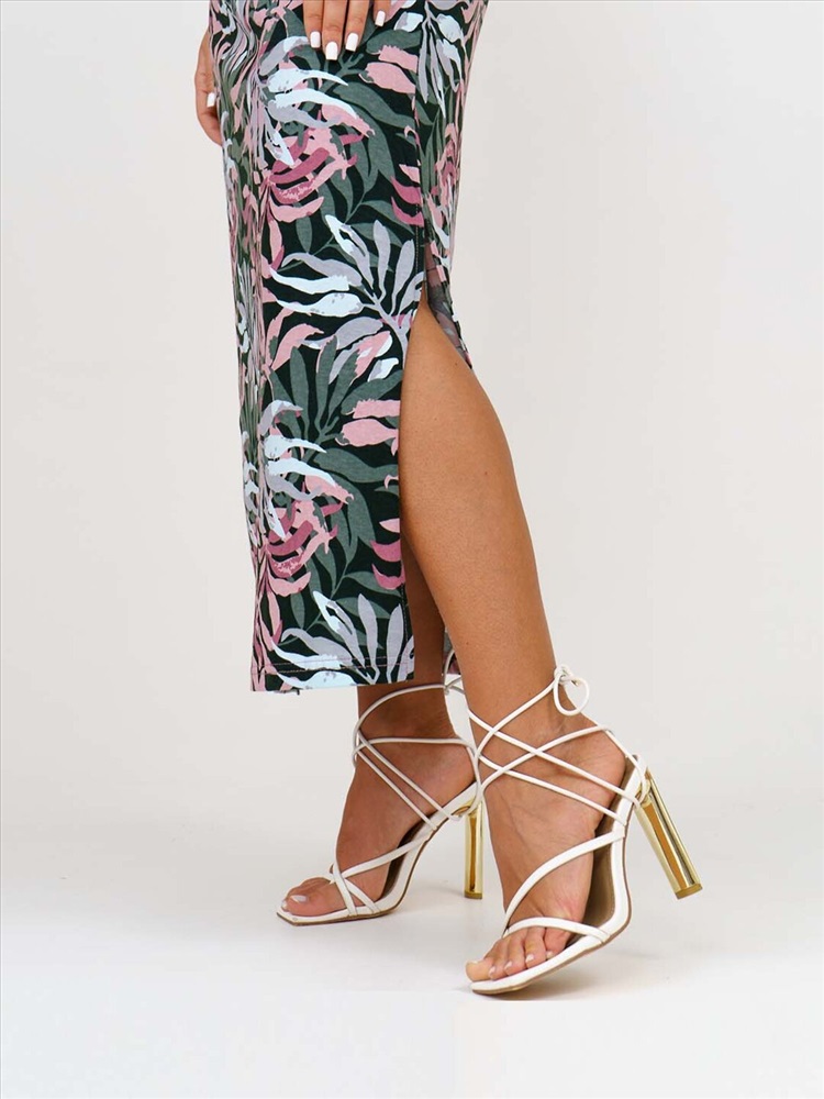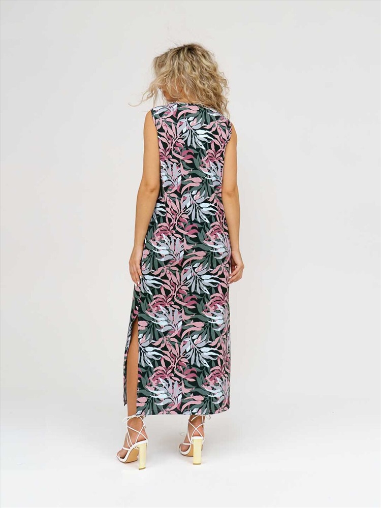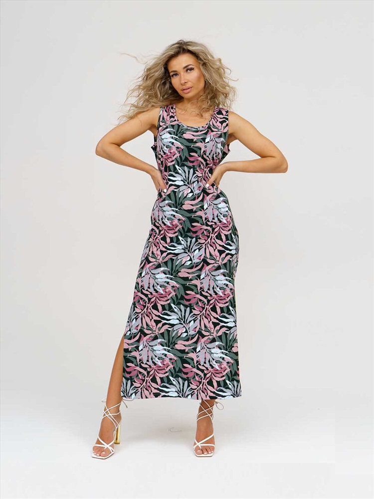Сарафан женский прилегающего силуэта, длиной до уровня лодыжки. Вырез горловины - лодочка. Без рукавов. Есть карманы с отрезным бочком. Нижняя часть сарафана имеет вырез.