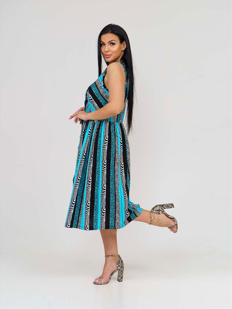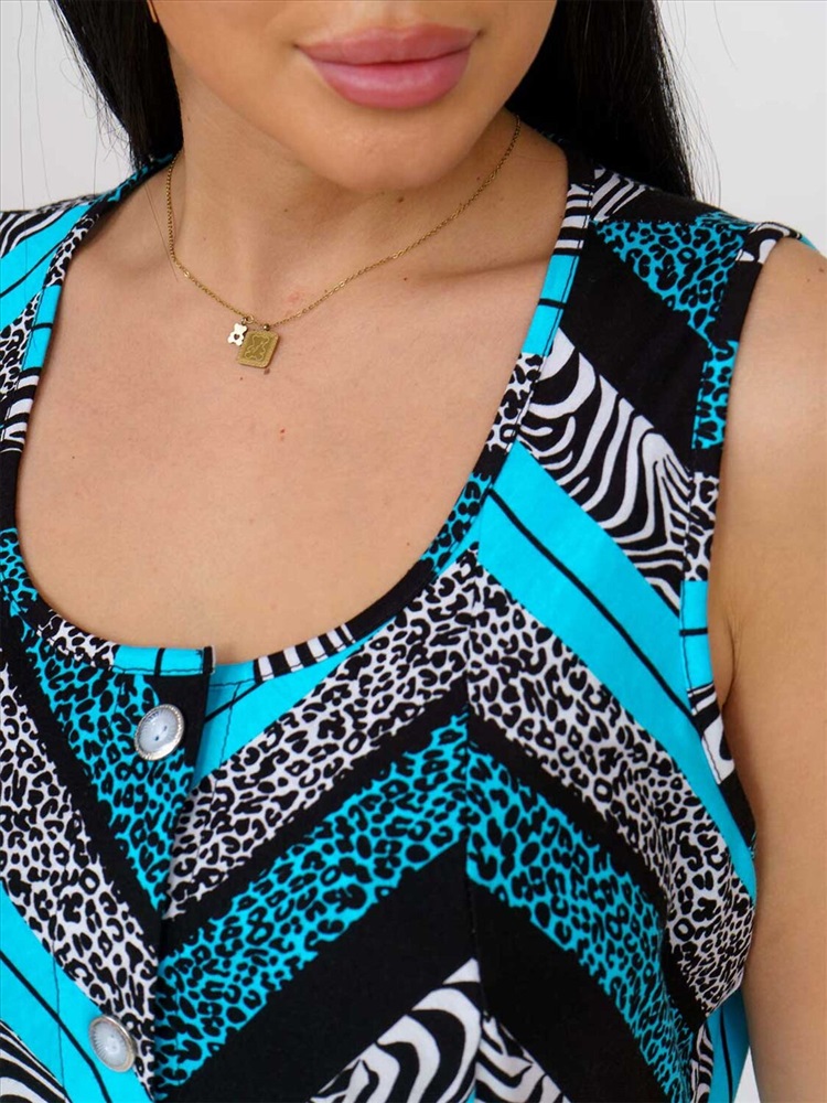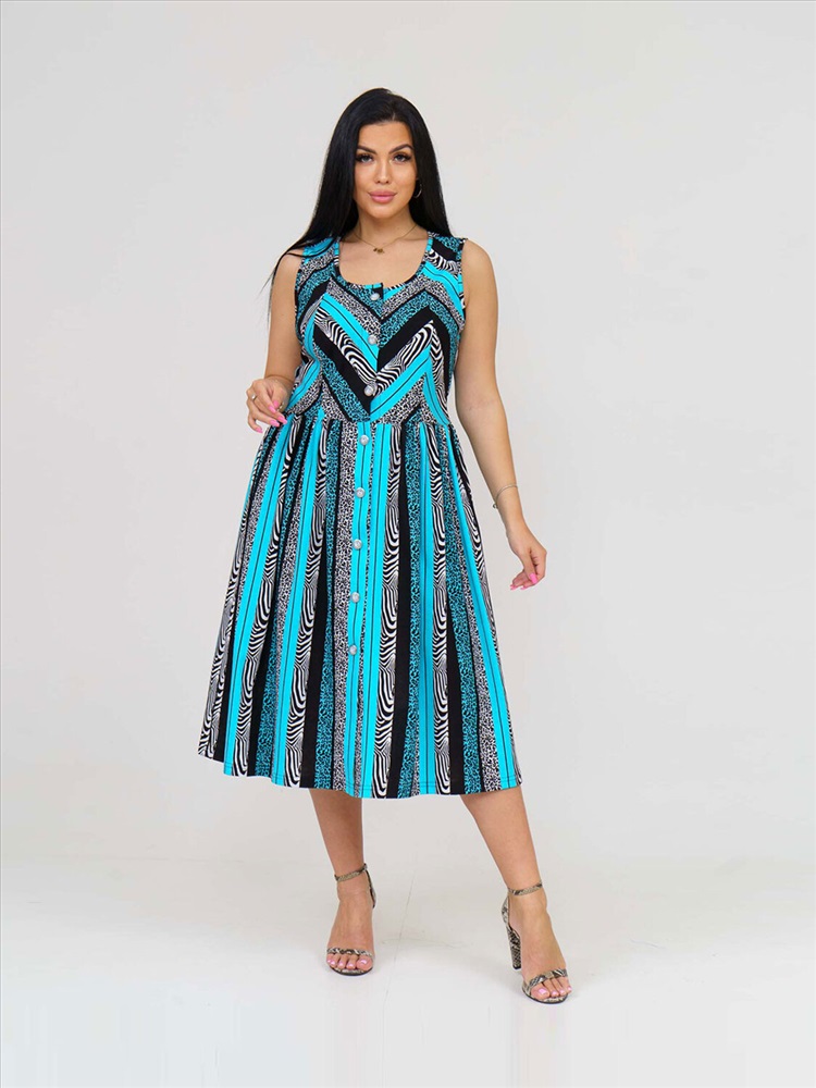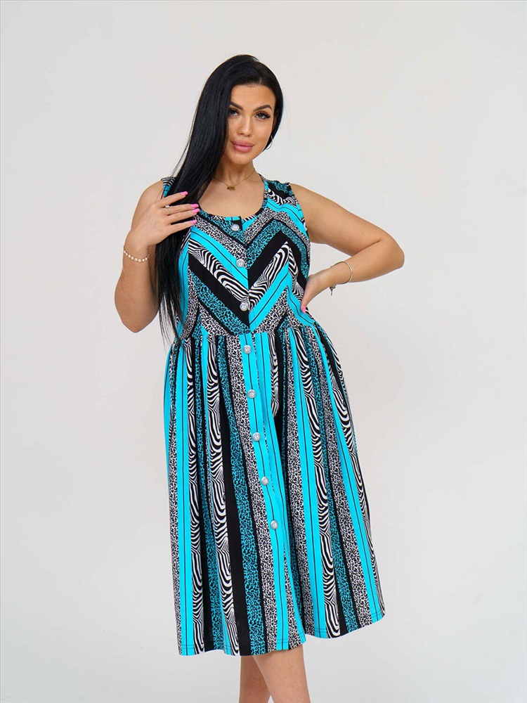 Сарафан женский на пуговицах свободного силуэта,отрезное по линии талии с резным лифом, длиной ниже колен. Вырез горловины - О образный. Без рукавов.