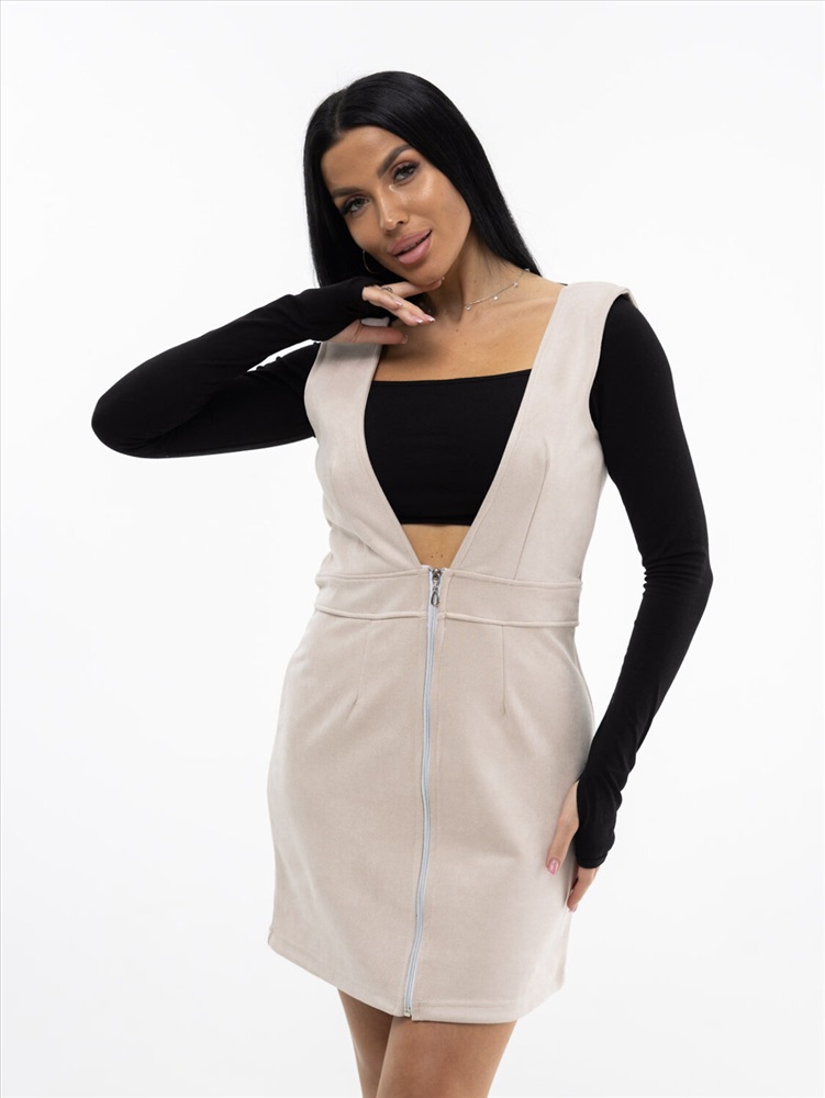 Женский замшевый сарафан с V-образным вырезом, длины мини. Отлично будет смотреться с водолазкой или рубашкой. Идеально дополнит базовый гардероб, с ним Вы сможете составить много новых образов.