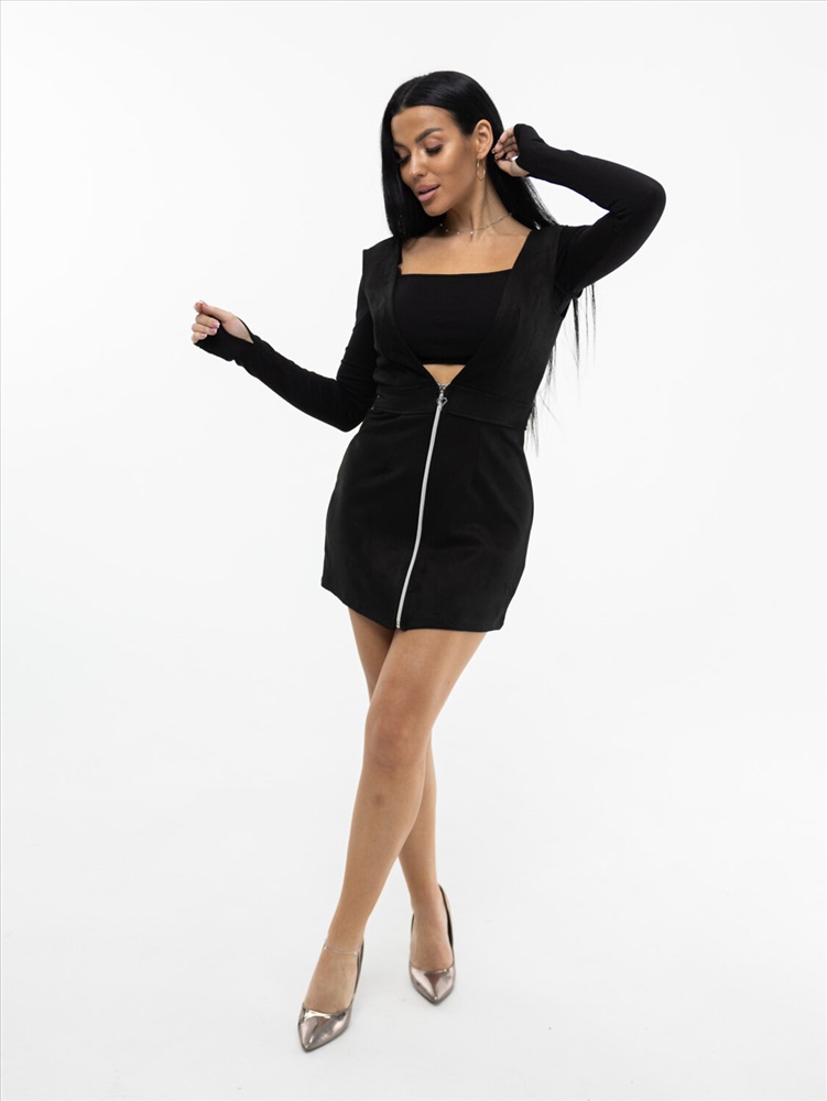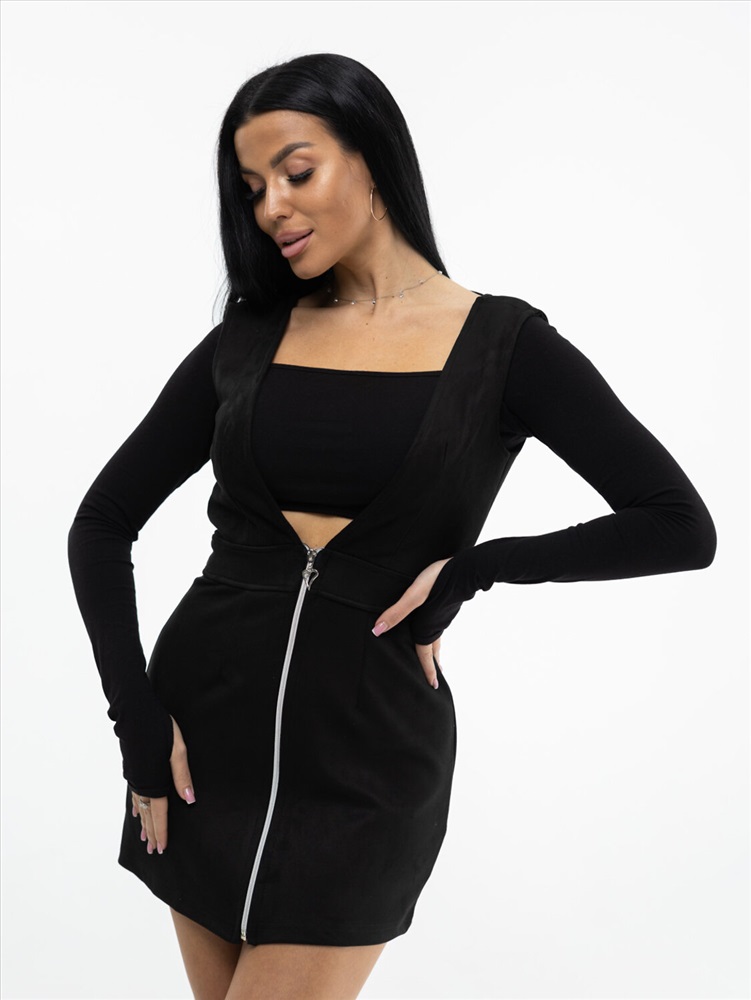 Женский замшевый сарафан с V-образным вырезом, длины мини. Отлично будет смотреться с водолазкой, рубашкой или топом. Идеально дополнит базовый гардероб, с ним Вы сможете составить много новых образов.
