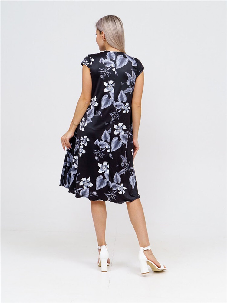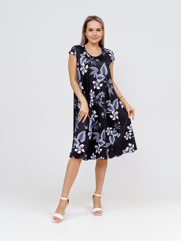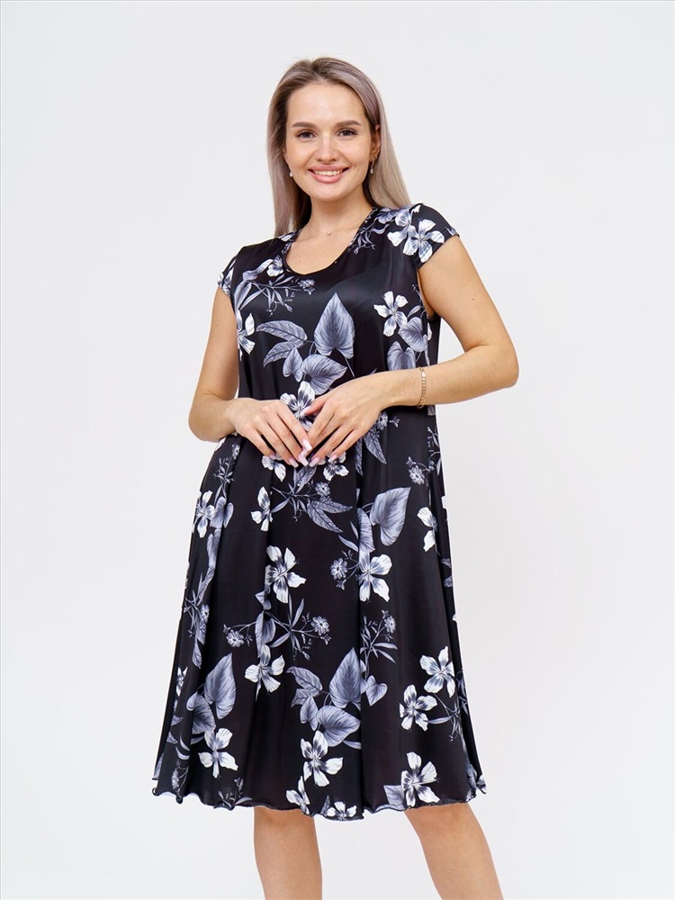Легкий женский сарафан, расклешенный к низу, длиной ниже колена. Сарафан отлично подчеркивает достоинства фигуры, за счет "шелковистой" фактуры ткани, короткий рукав "крылышко" отлично скроет лишний обьем в области рук, а О-образная горловина будет хорошо смотреться с любыми украшениями.