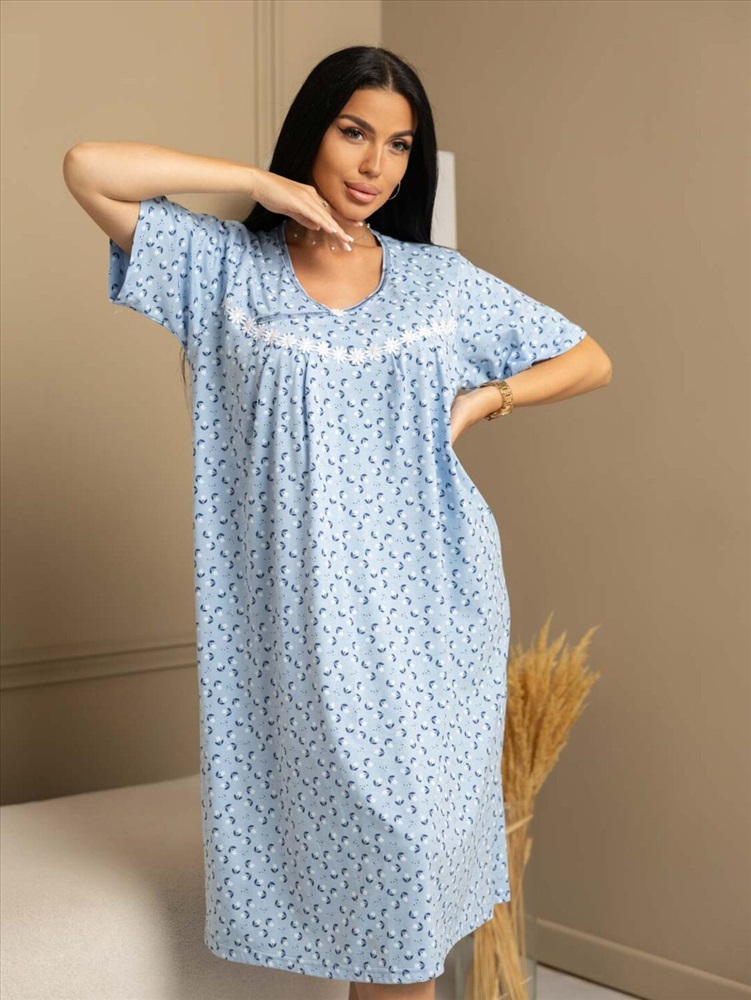 Ночная сорочка женская из трикотажного полотна - кулирка, прямого силуэта, с притачной кокеткой по верху переда, со складками по линии соединения кокетки и полочки, поверх шва соединения кокетки и полочки нашита декоративная тесьма с ромашками. Вырез горловины О-образный и обработан окантовкой. Рукав втачной, базового покроя, короткий.