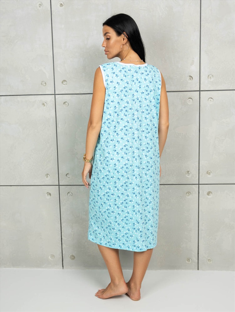 Ночная женская сорочка из хлопка, свободного силуэта, длиной ниже колена. Спереди кокетка отделанная шитьем, вырез горловины V-образный.