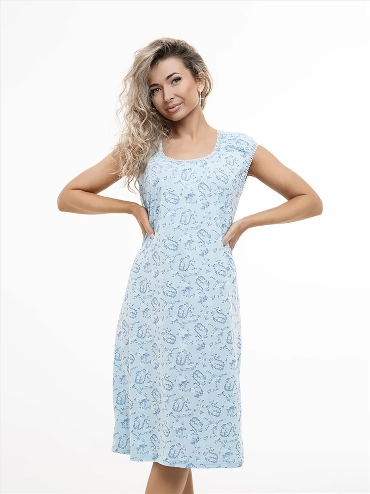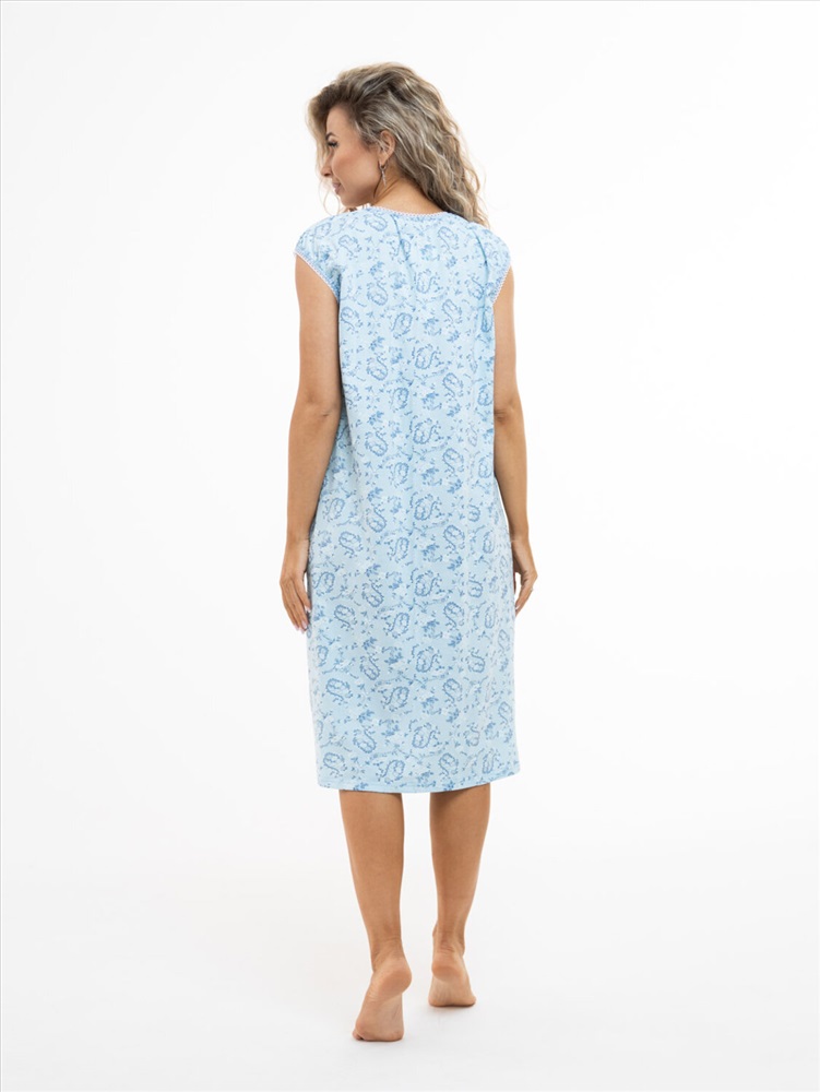 Ночная сорочка женская выполнена из хлопкового материала. Сорочка длиной ниже колена. Вырез горловины О-образный.