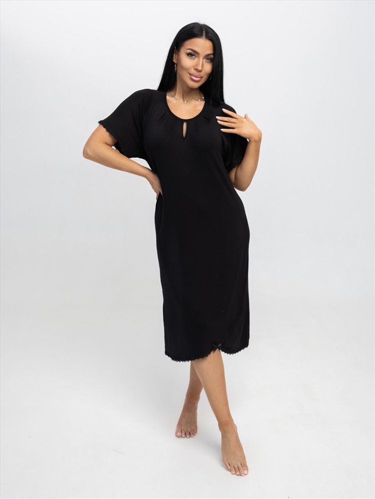 Сорочка женская для сна, длиной ниже уровня колена. Рукав - цельнокройный, короткий. Горловина округлая, выполнена в стиле - замочная скважина. Низ изделия и края рукавов имеют отделку кружевом.