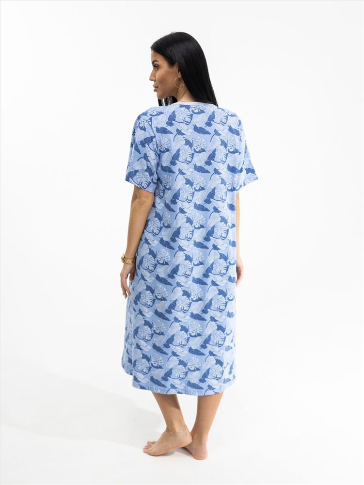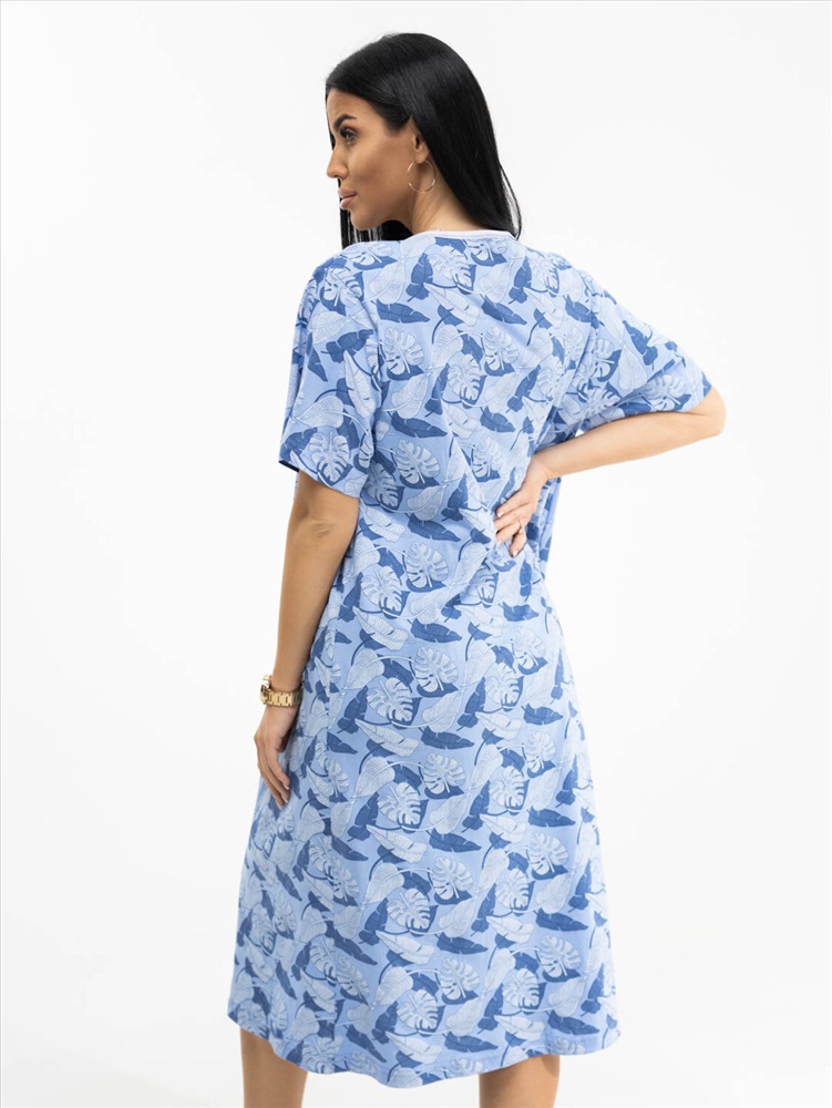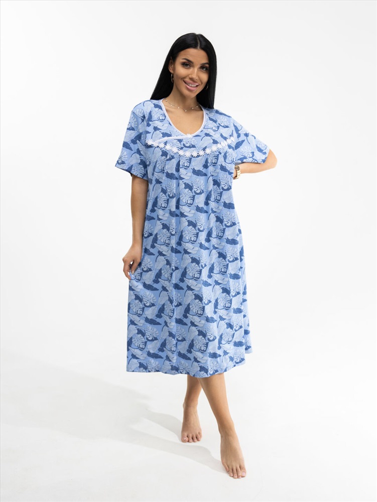 Ночная сорочка женская из трикотажного полотна - кулирка, прямого силуэта, с притачной кокеткой по верху переда, со складками по линии соединения кокетки и полочки, поверх шва соединения кокетки и полочки нашита декоративная тесьма с ромашками. Вырез горловины О-образный и обработан окантовкой. Рукав втачной, базового покроя, короткий.