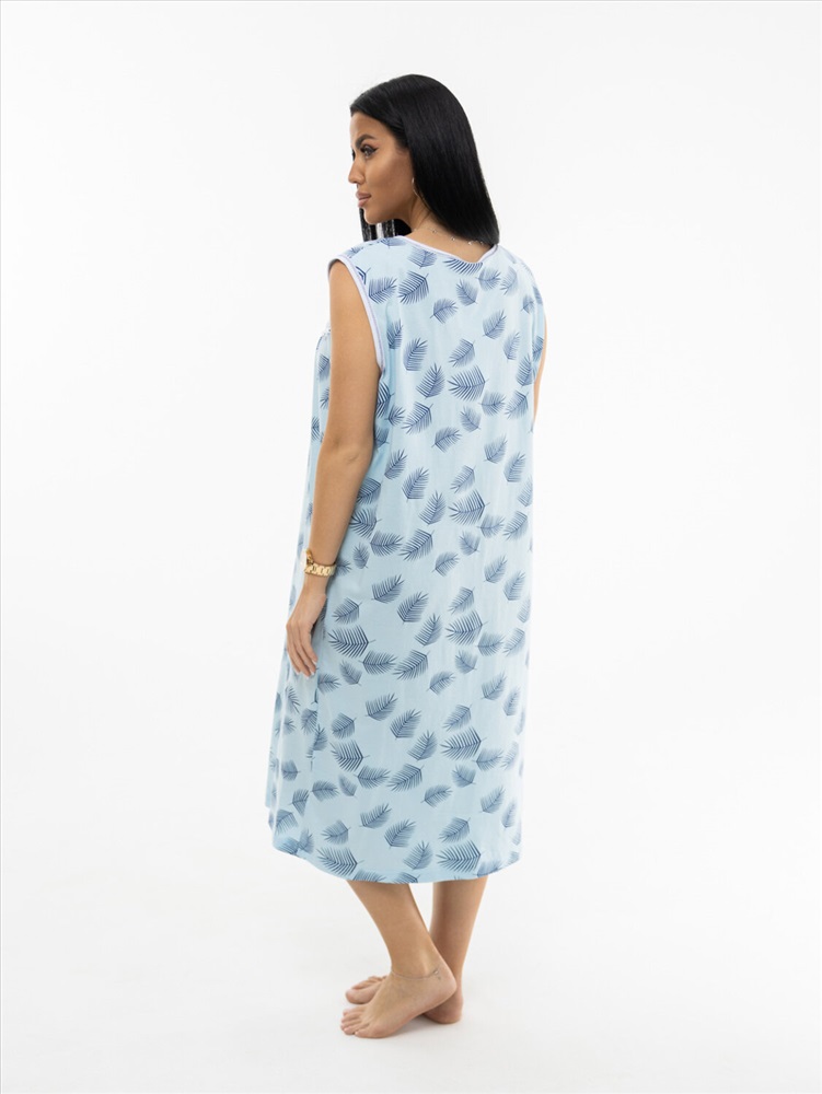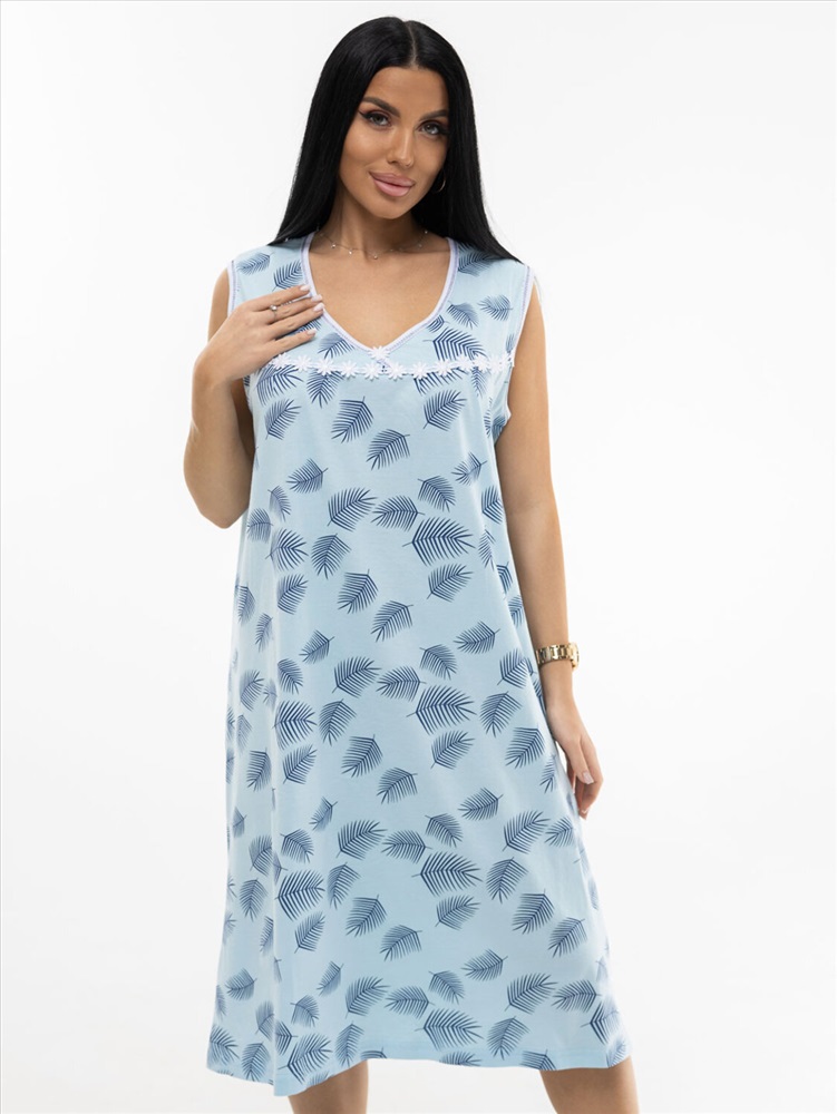 Ночная женская сорочка из хлопка, свободного силуэта, длиной ниже колена. Спереди кокетка отделанная шитьем, вырез горловины V-образный.