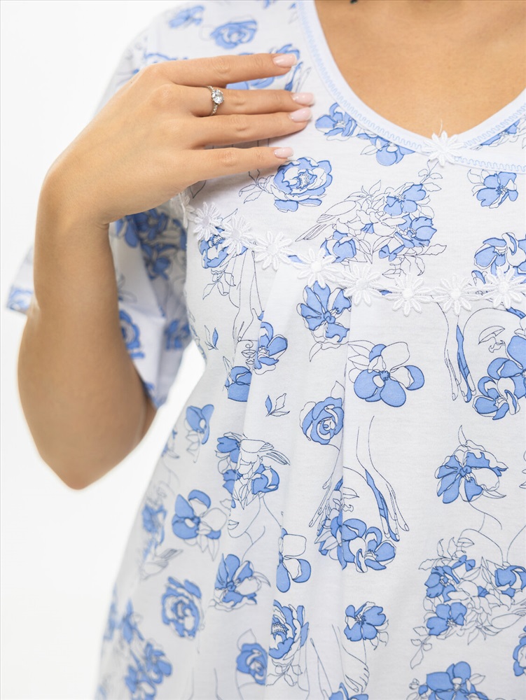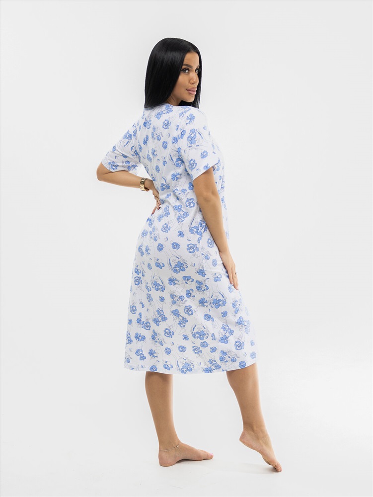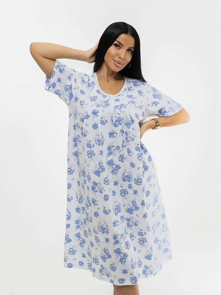 Ночная сорочка женская из трикотажного полотна - кулирка, прямого силуэта, с притачной кокеткой по верху переда, со складками по линии соединения кокетки и полочки, поверх шва соединения кокетки и полочки нашита декоративная тесьма с ромашками. Вырез горловины О-образный и обработан окантовкой. Рукав втачной, базового покроя, короткий.