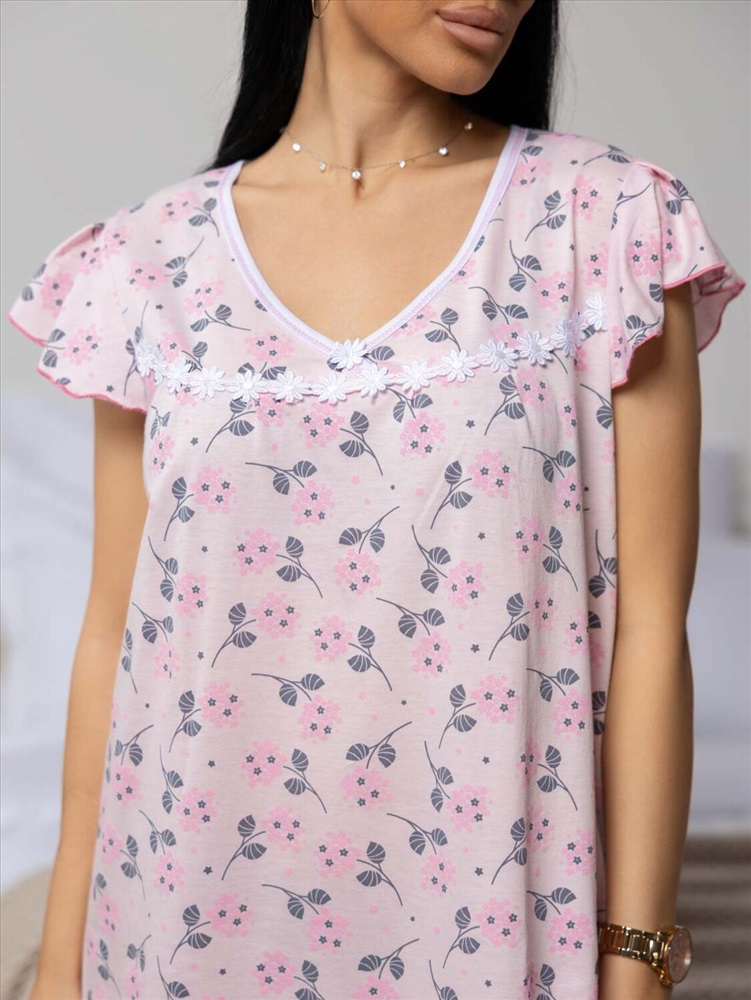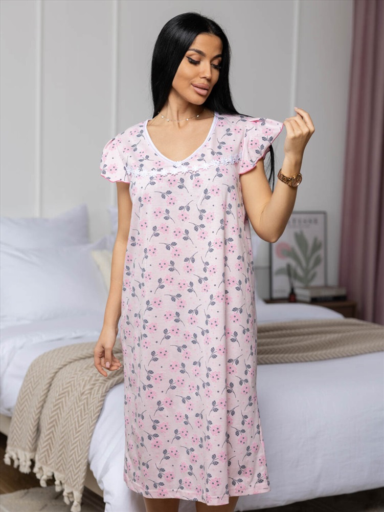 Женская ночьная сорочка из хлопка, длиной ниже колена, с рукавом воланом и V-образной горловиной, украшена кружевом. Материал приятный к телу, обеспечивает комфорт во время сна.