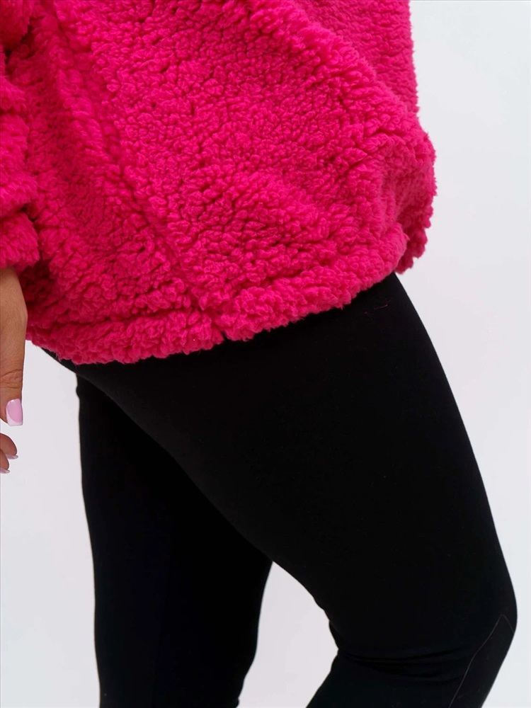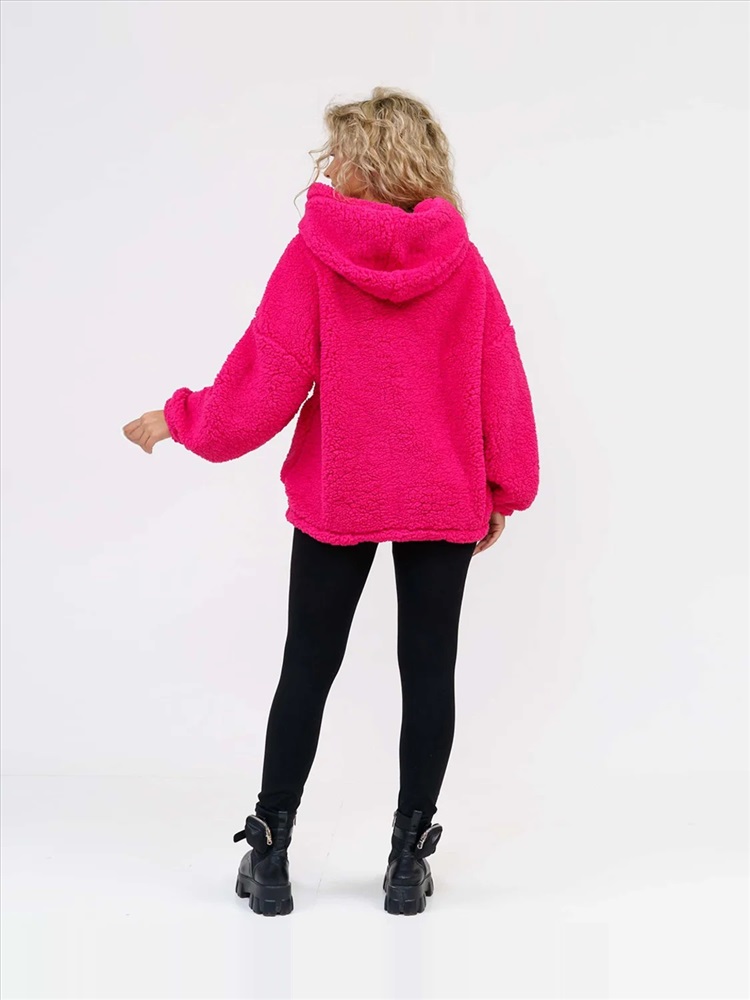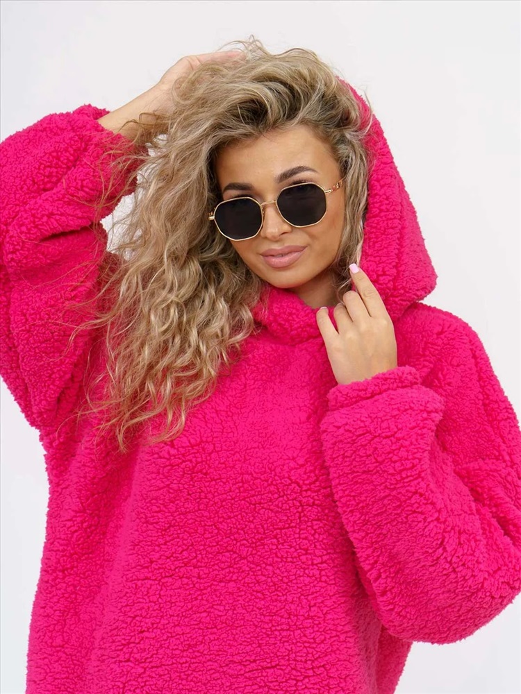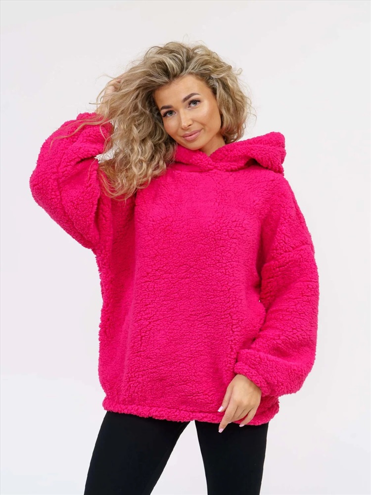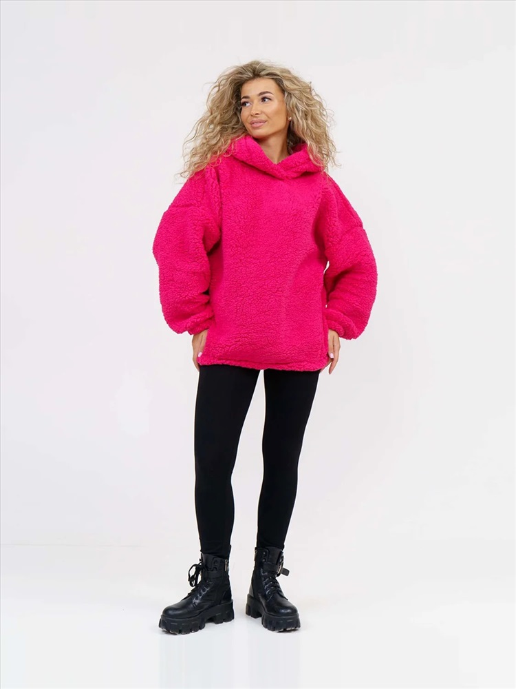Толстовка оверсайз станет прекрасным подарком на любой праздник! Шерпа – синтетическое полотно с имитацией меха на лицевой поверхности. На ощупь материал плотный, приятный, мягкий. Хорошо согревает. Изнаночная сторона – текстильное полотно трикотажного переплетения. Фактура ткани хорошо видна на фото. Идеально подойдет для прохладного времени года. Толстовка идеально сочетается с любыми вещами в гардеробе с джинсами, юбкой, можно надеть поверх платья холодным вечером. Она непременно понравится взрослым женщинам и девочкам - подросткам.