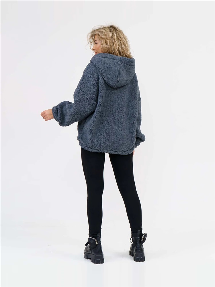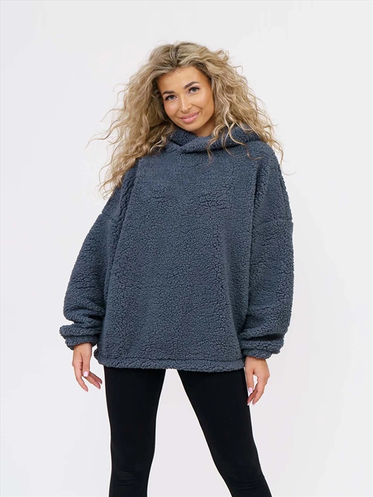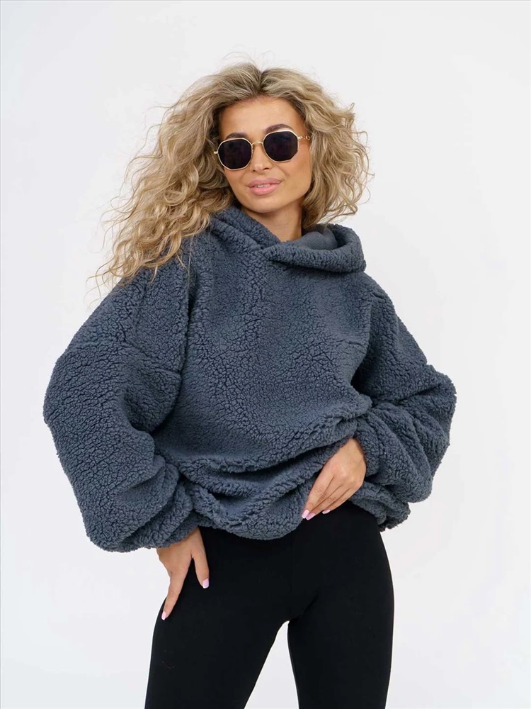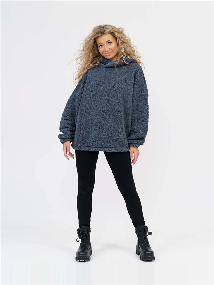 Толстовка оверсайз станет прекрасным подарком на любой праздник! Шерпа – синтетическое полотно с имитацией меха на лицевой поверхности. На ощупь материал плотный, приятный, мягкий. Хорошо согревает. Изнаночная сторона – текстильное полотно трикотажного переплетения. Фактура ткани хорошо видна на фото. Идеально подойдет для прохладного времени года. Толстовка идеально сочетается с любыми вещами в гардеробе с джинсами, юбкой, можно надеть поверх платья холодным вечером. Она непременно понравится взрослым женщинам и девочкам - подросткам.
