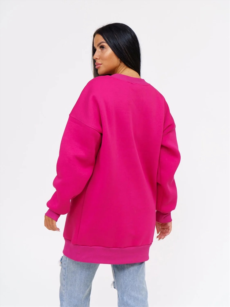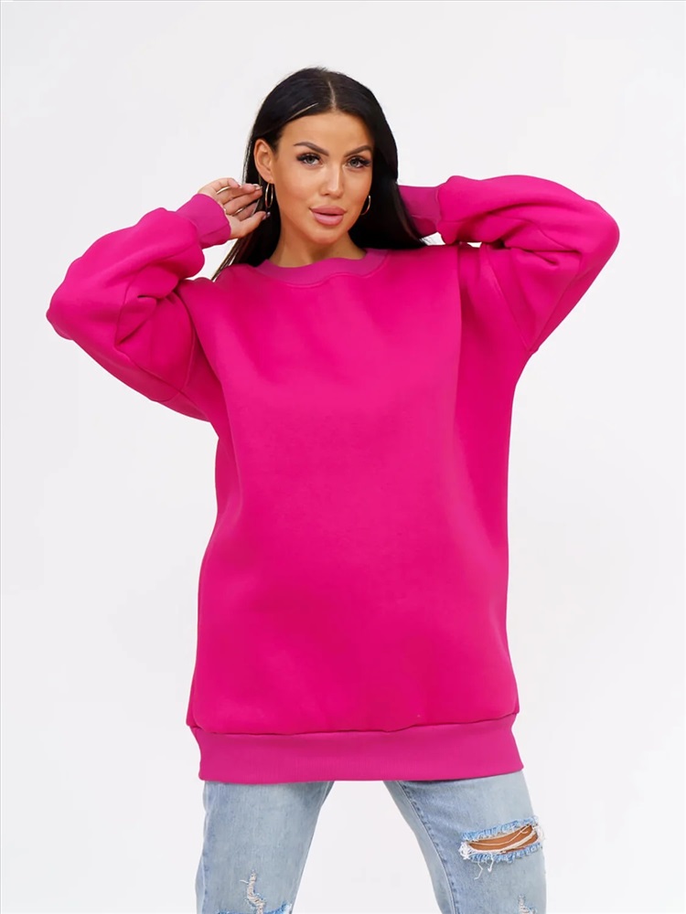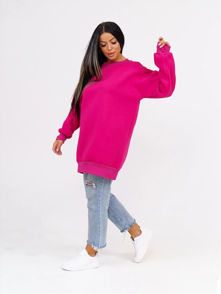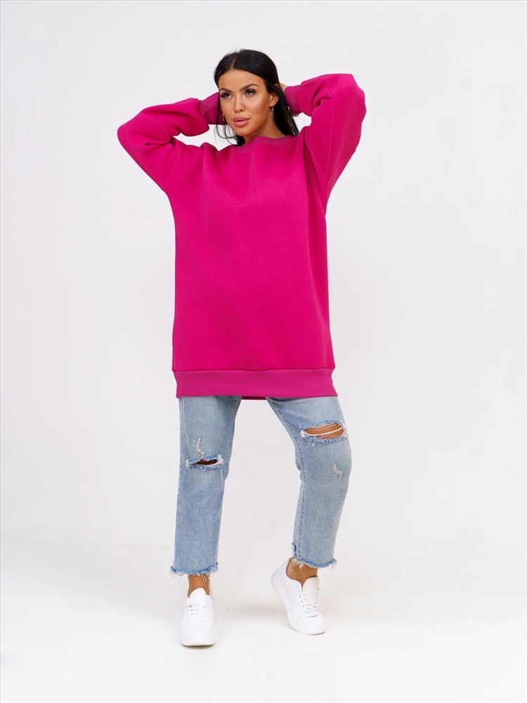 Толстовка женская оверсайз выполнена из качественного хлопкового трикотажа с начесом (футер 3-х нитка с начесом). который не деформируется при стирке и во время носки, благодаря этому материалу однотонный свиншот утепленный будет радовать вас своим видом и дарить приятные тактильные ощущения не один сезон. Стильная базовая толстовка подчеркнет достоинства фигуры. Теплая и уютная вещь в спортивном стиле заменит вам худи с начесом из флиса и школьную кофту, пуловер и толстовку с капюшоном, свитер и джемпер. Удлиненная толстовка свободного кроя деликатно скроет несовершенства полной фигуры. Объемная модель с длинным рукавом на манжете и округлым вырезом горловины удобна в повседневной носке: она не сковывает телодвижения, отлично комбинируется с одеждой разных стилей и фасонов, цветов и фактур.