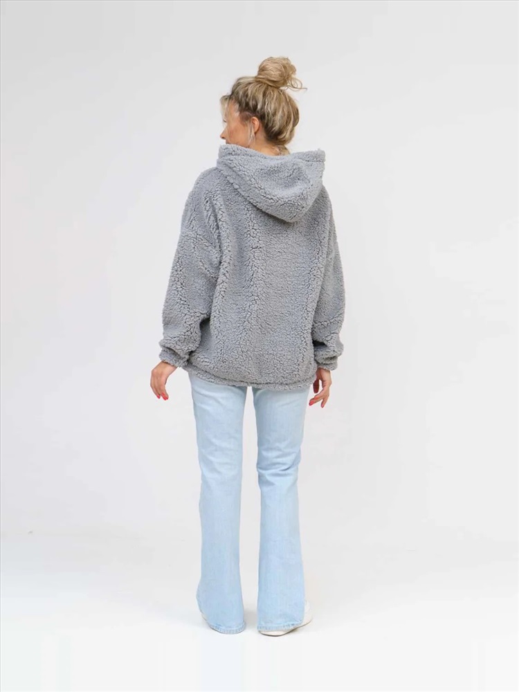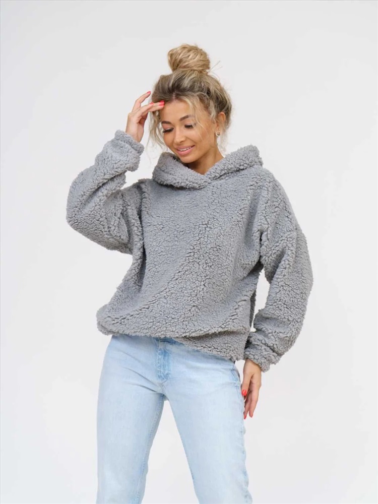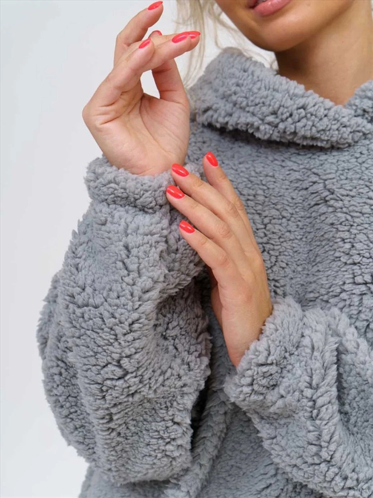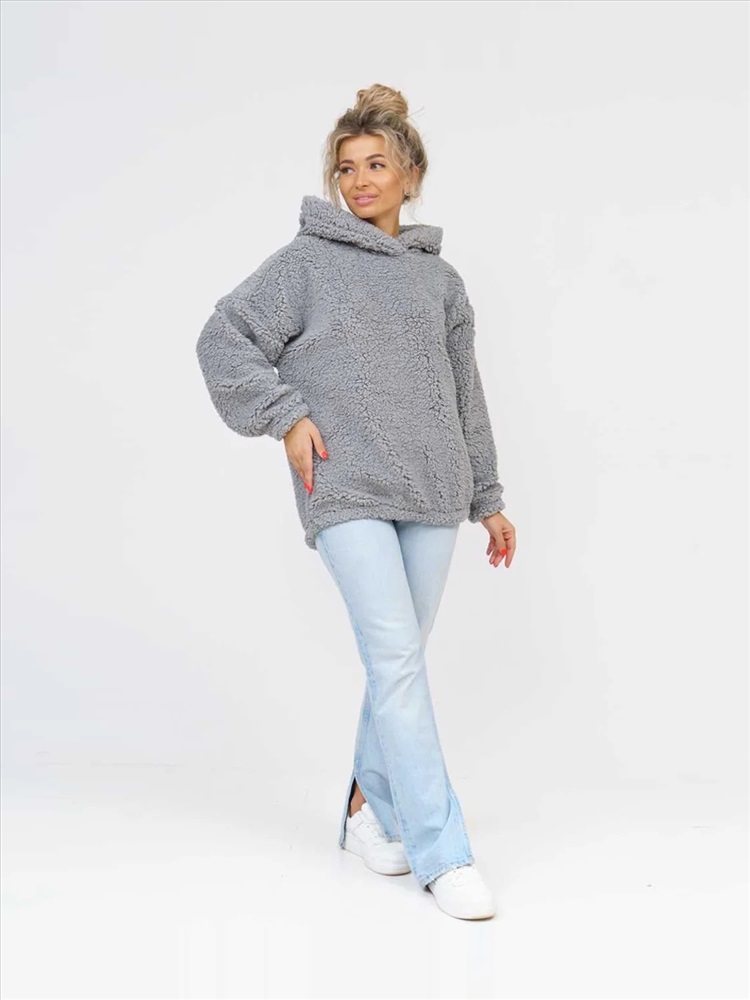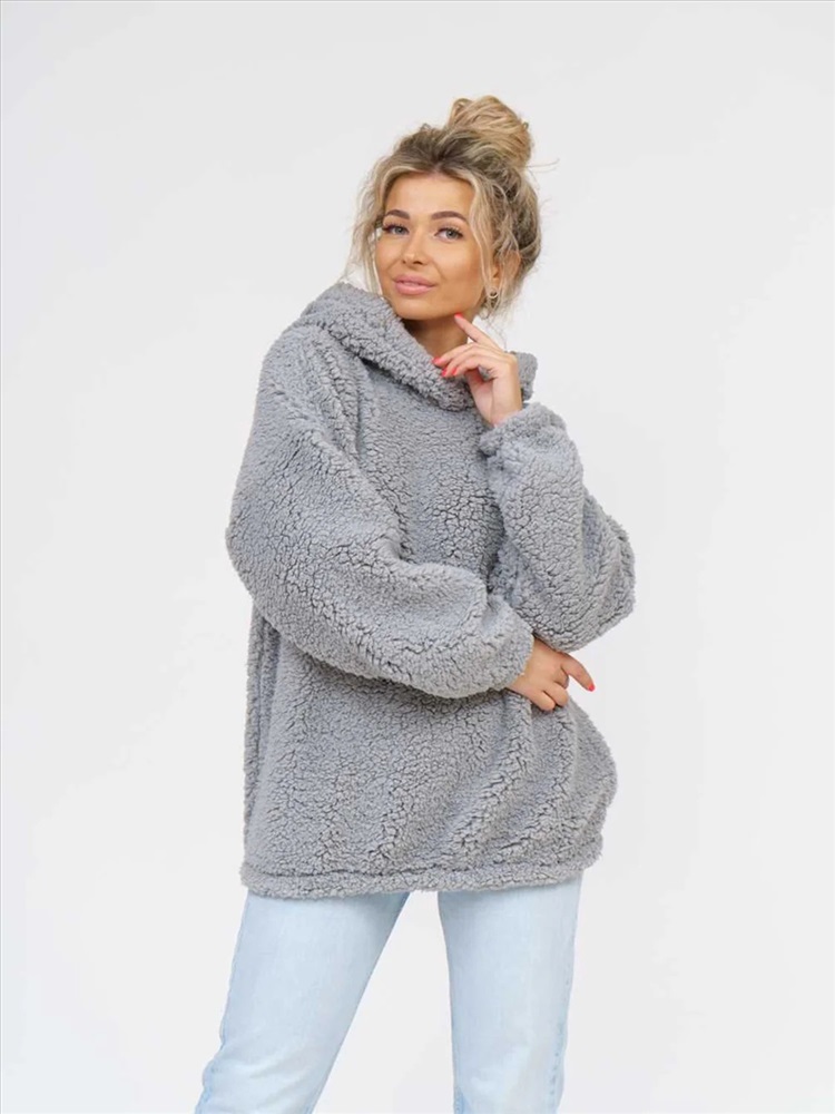 Толстовка оверсайз станет прекрасным подарком на любой праздник! Шерпа – синтетическое полотно с имитацией меха на лицевой поверхности. На ощупь материал плотный, приятный, мягкий. Хорошо согревает. Изнаночная сторона – текстильное полотно трикотажного переплетения. Фактура ткани хорошо видна на фото. Идеально подойдет для прохладного времени года. Толстовка идеально сочетается с любыми вещами в гардеробе с джинсами, юбкой, можно надеть поверх платья холодным вечером. Она непременно понравится взрослым женщинам и девочкам - подросткам.